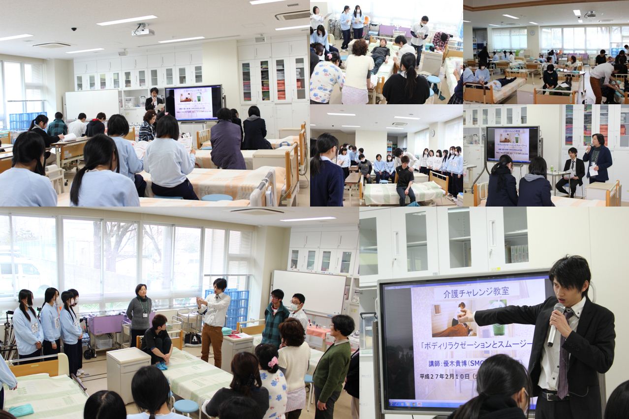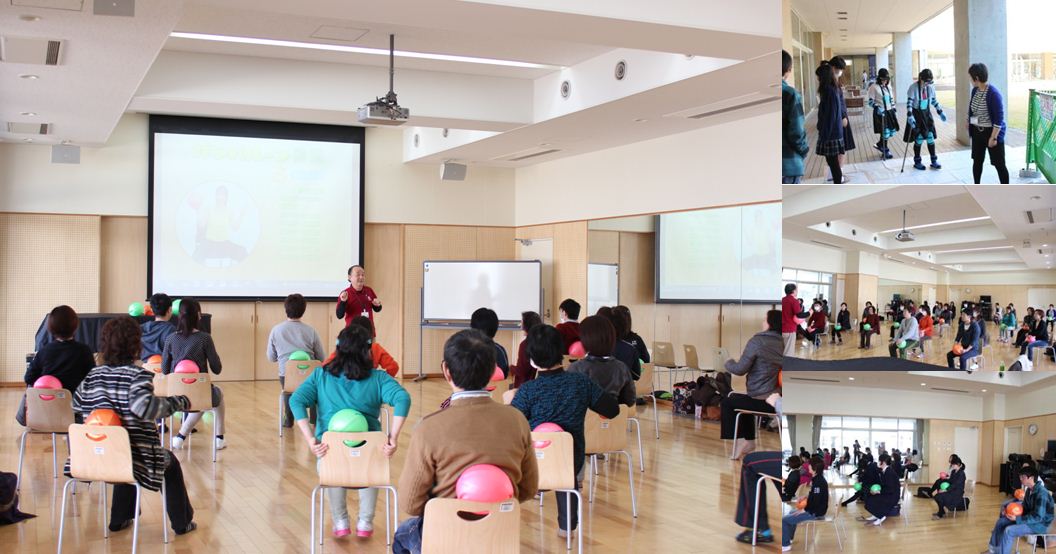 生活福祉学科で毎年開催している。介護チャレンジ教室。今年度は、「利用者を癒すボディリラクゼーションとスムージー」、「介護疑似体験&ガンバルーンで介護予防」の二つのテーマで開催しました。
