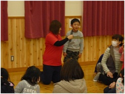 お次は、「猛獣狩りに行こうよ」というゲームです。お姉さんが言う動物の文字数に合わせて、グループを作ります。