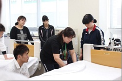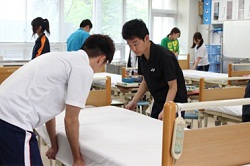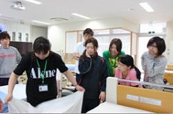 利用者の生活の場となるベッドをいかにきれいに手早くつくるか、みんな真剣な表情で取り組みました。