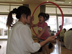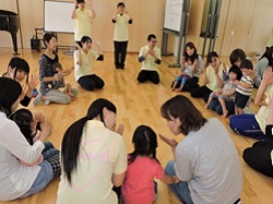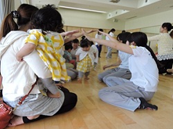 最初は恥ずかしがっていた子ども達もお母さんのおひざに座ったり、手をつないだりすることで身体を動かすことの楽しさに気付いたようでした。
