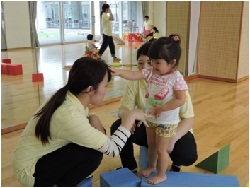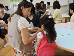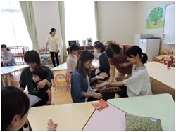 また、お母さんの所へ行き、担当の学生にハンドケアをしてもらっているお子さんもいました。とてもリラックスした時間を過ごすことができました。