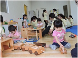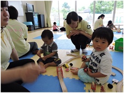 子ども達は学生と一緒に自由遊びをしました。工事で動いているショベルカーなどを見て楽しんでいる様子でした。