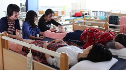 まず、リフレクソロジーの概要や反射区、足裏のツボなどを勉強し、その後いよいよ実技です。 |