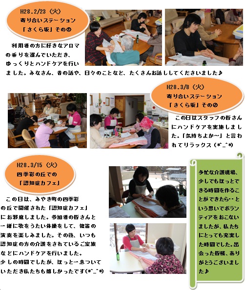 本学短期大学部とみやき町は連携協定を結んでいます。生活福祉学科では、その連携事業の一環として、アロマを使ったハンドケアのボランティアをさせていただきました。