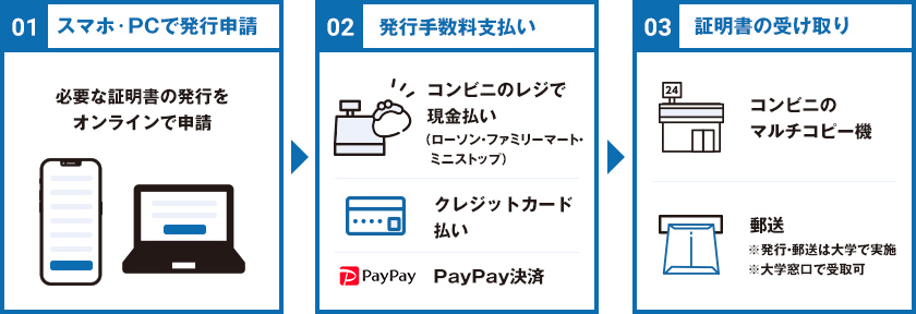 申請、決済をオンラインにて実施後、従来通り大学より郵送にて証明書をお送りいたします。