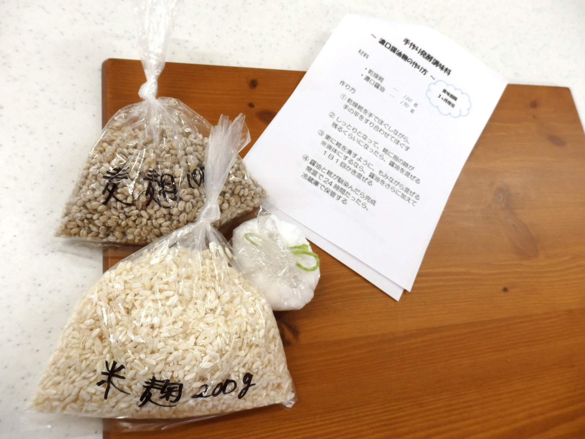 今日は、乾燥糀を使って「塩麹(米麹)」と「濃口醤油麹(麦麹)」の作り方を教わりました
