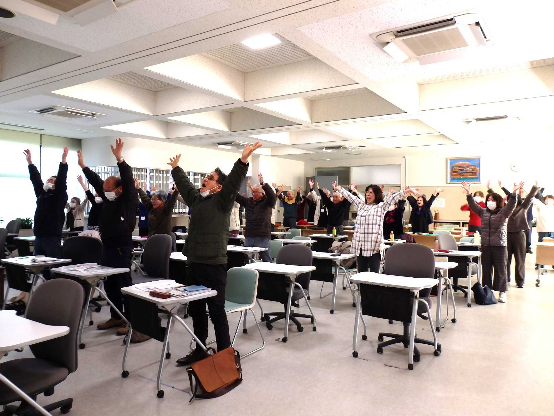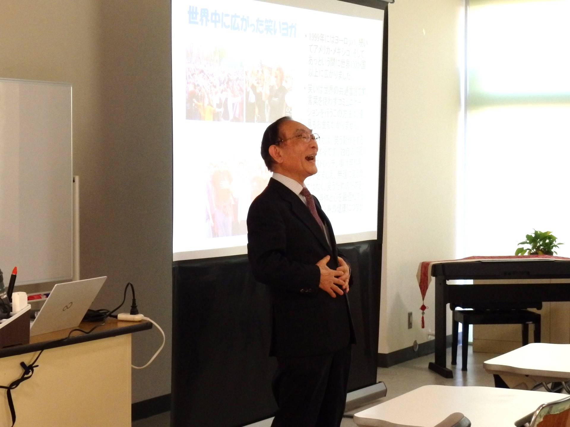 先生の講義を聞いた後は、先生のお手本をみて、みんなで元気に笑いヨガをしましたよ~