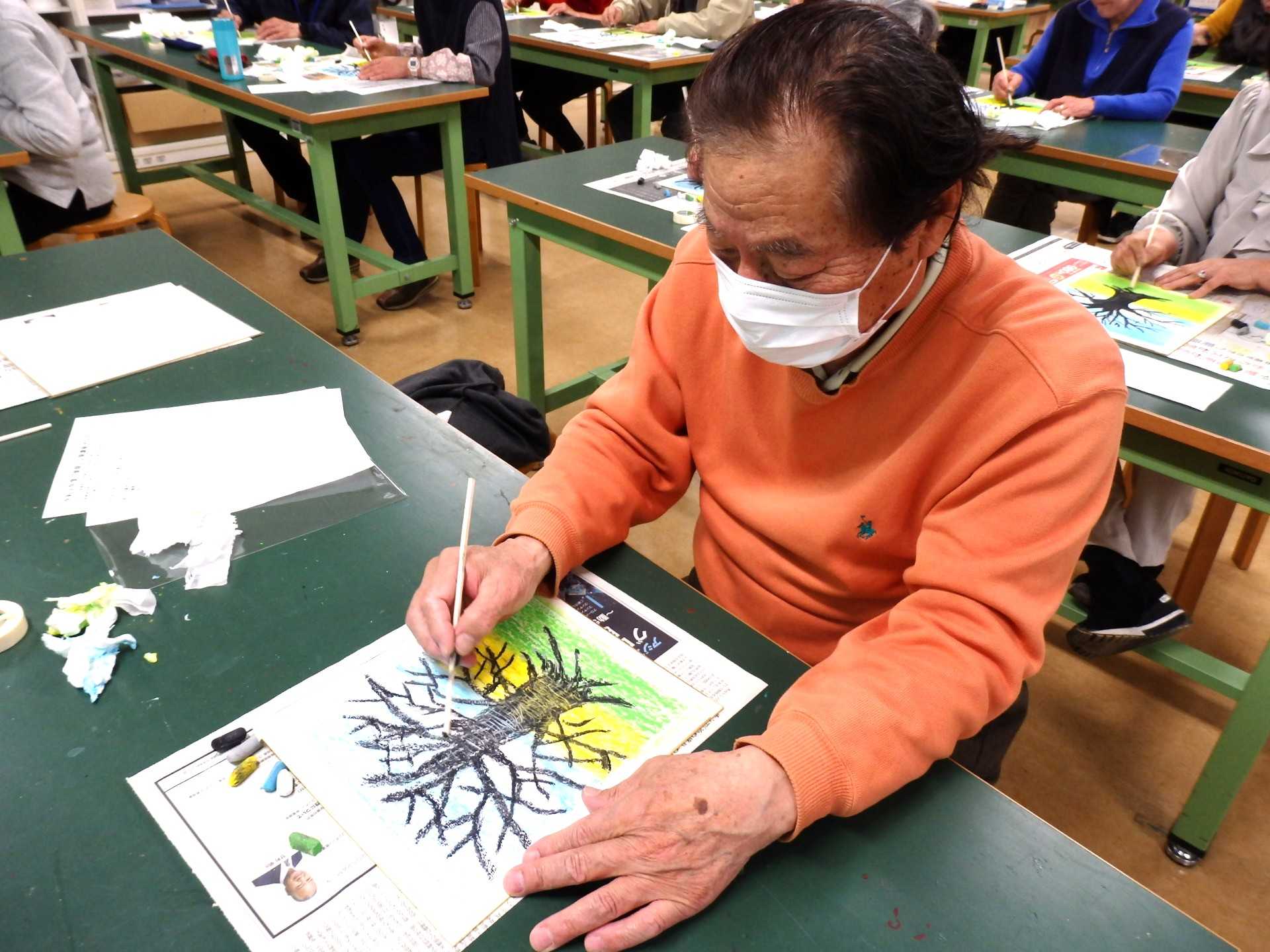 割りばしを使って幹や枝のクレパス部分を削っていきます