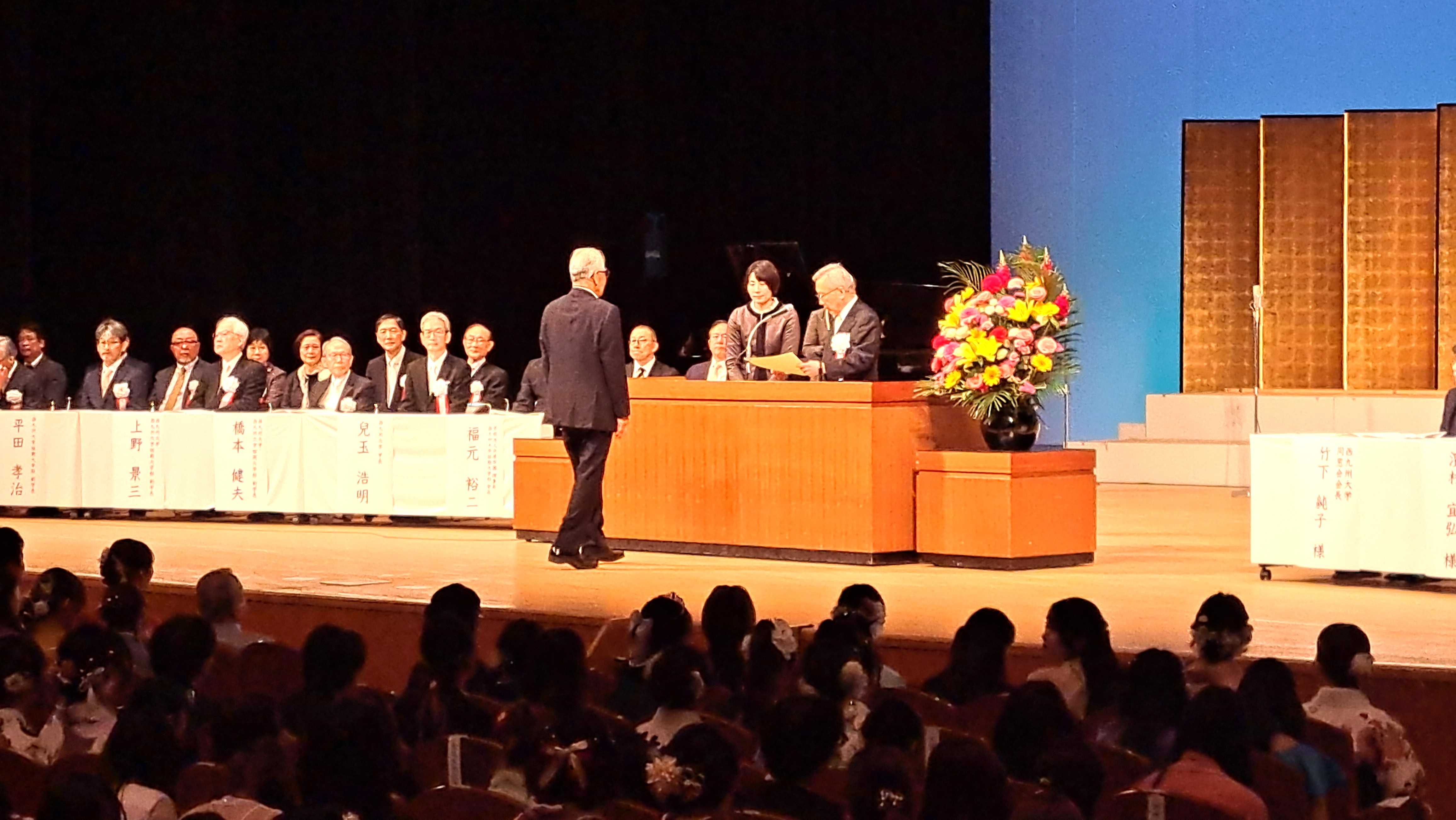 式の最後に、校歌斉唱がありステージ上の学生さん達のコーラスに合わせ