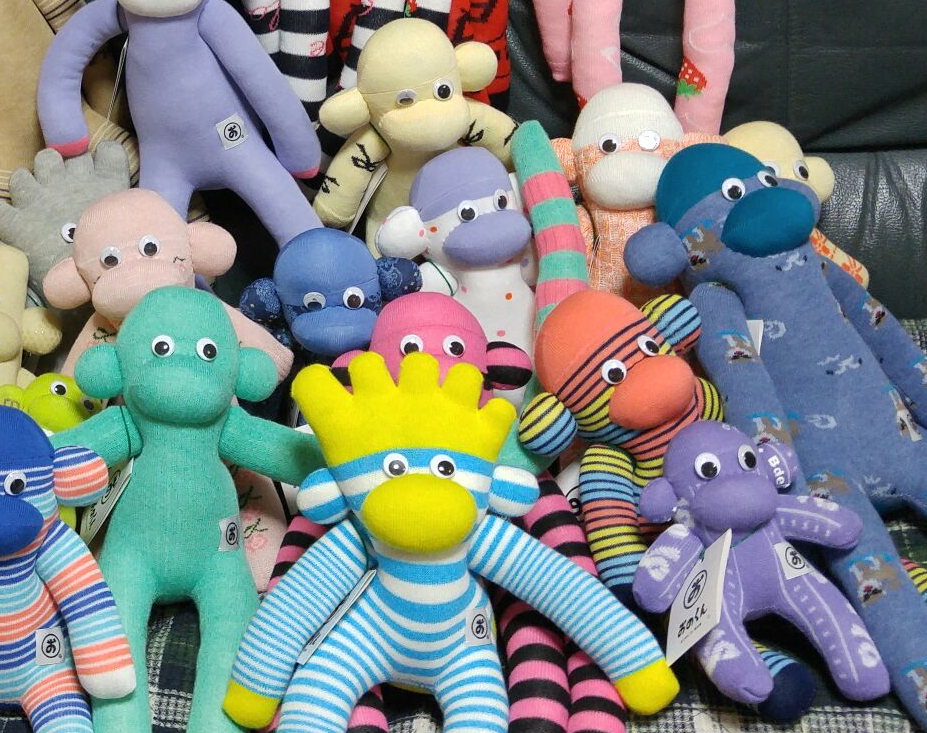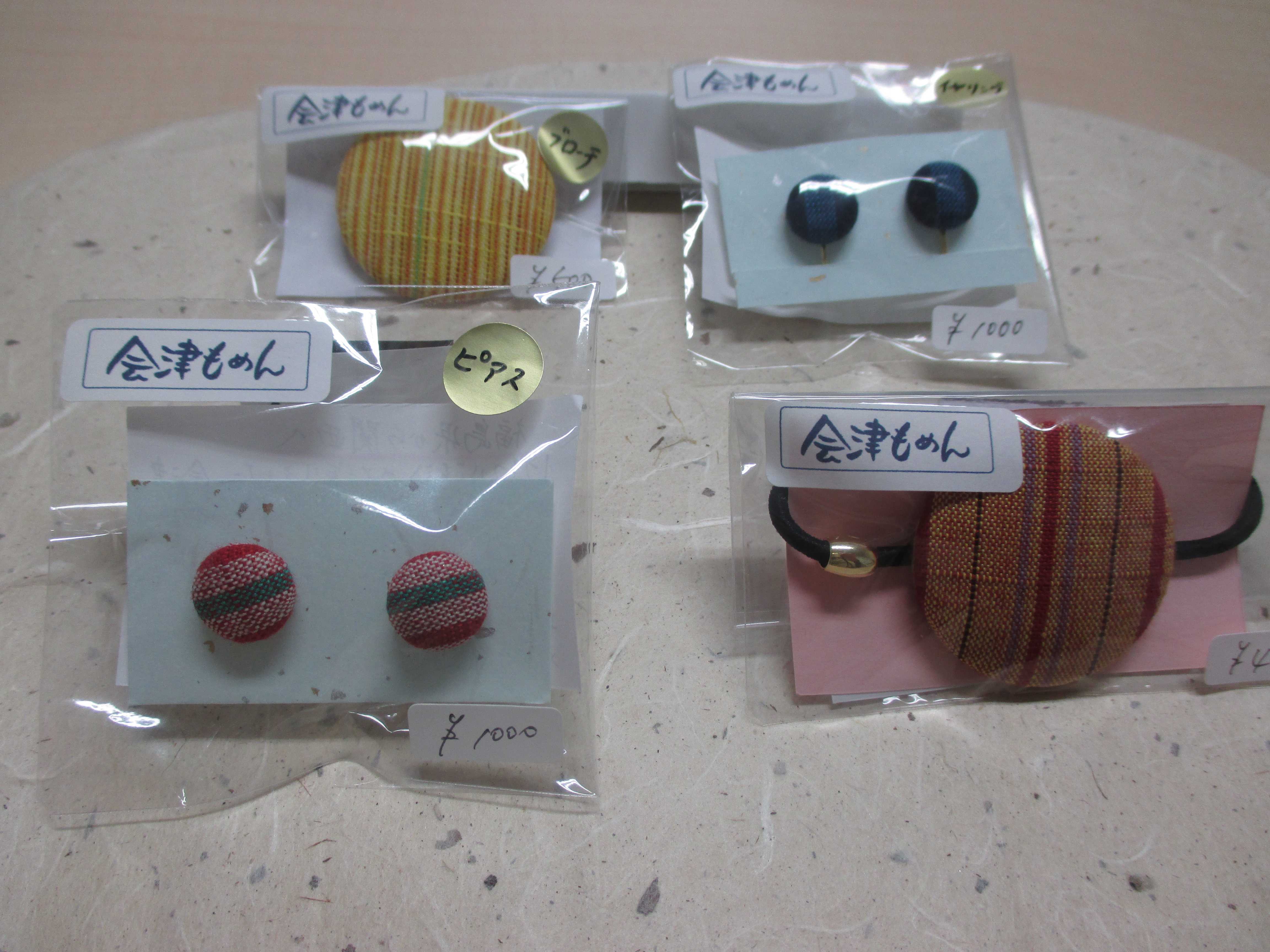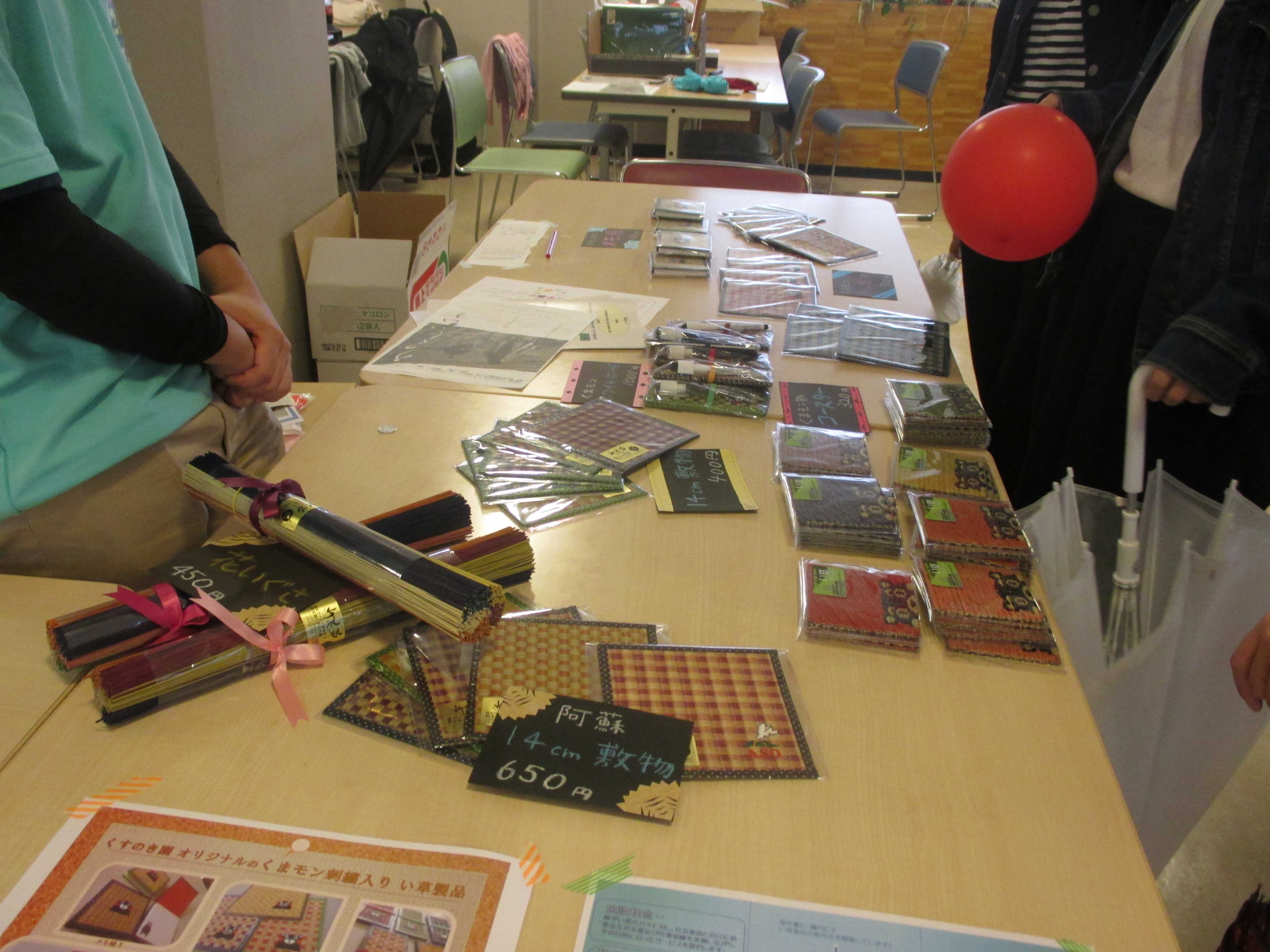熊本県と宮城県の物品販売は、社会福祉法人熊本県社会福祉事業団「熊本県くすのき園」のご協力のもと、い草で作成された「コースター」や「ランチョンマット」等を販売しました。また、「宮城県人会さが」のご協力で、仙台銘菓「仙臺まころん」、東松島市・小野仮設住宅の方々が作っているソックスモンキーの「おのくん」人形、福島県の伝統工芸品「会津木綿」で作られたピアスやブローチなどを販売しました