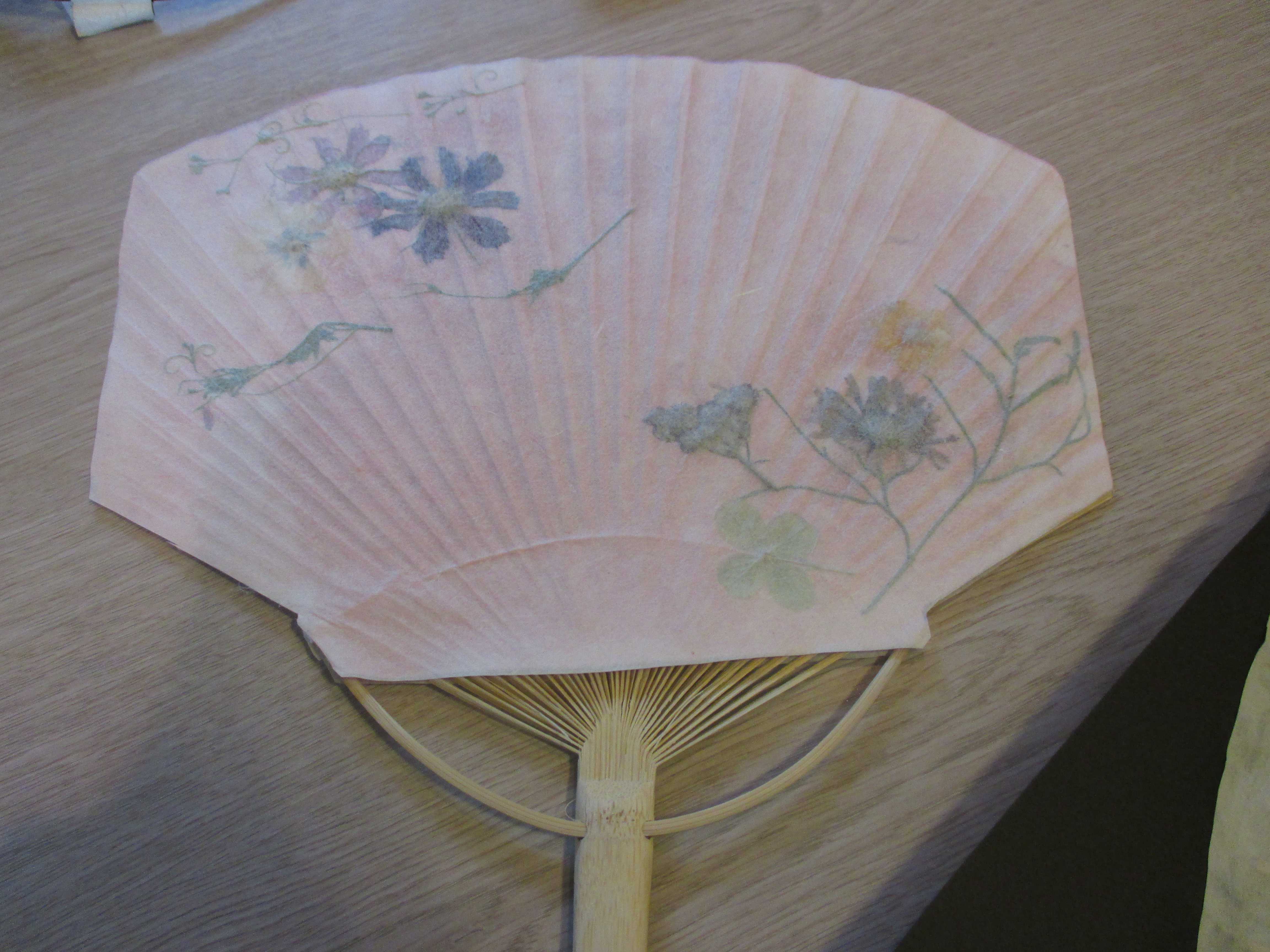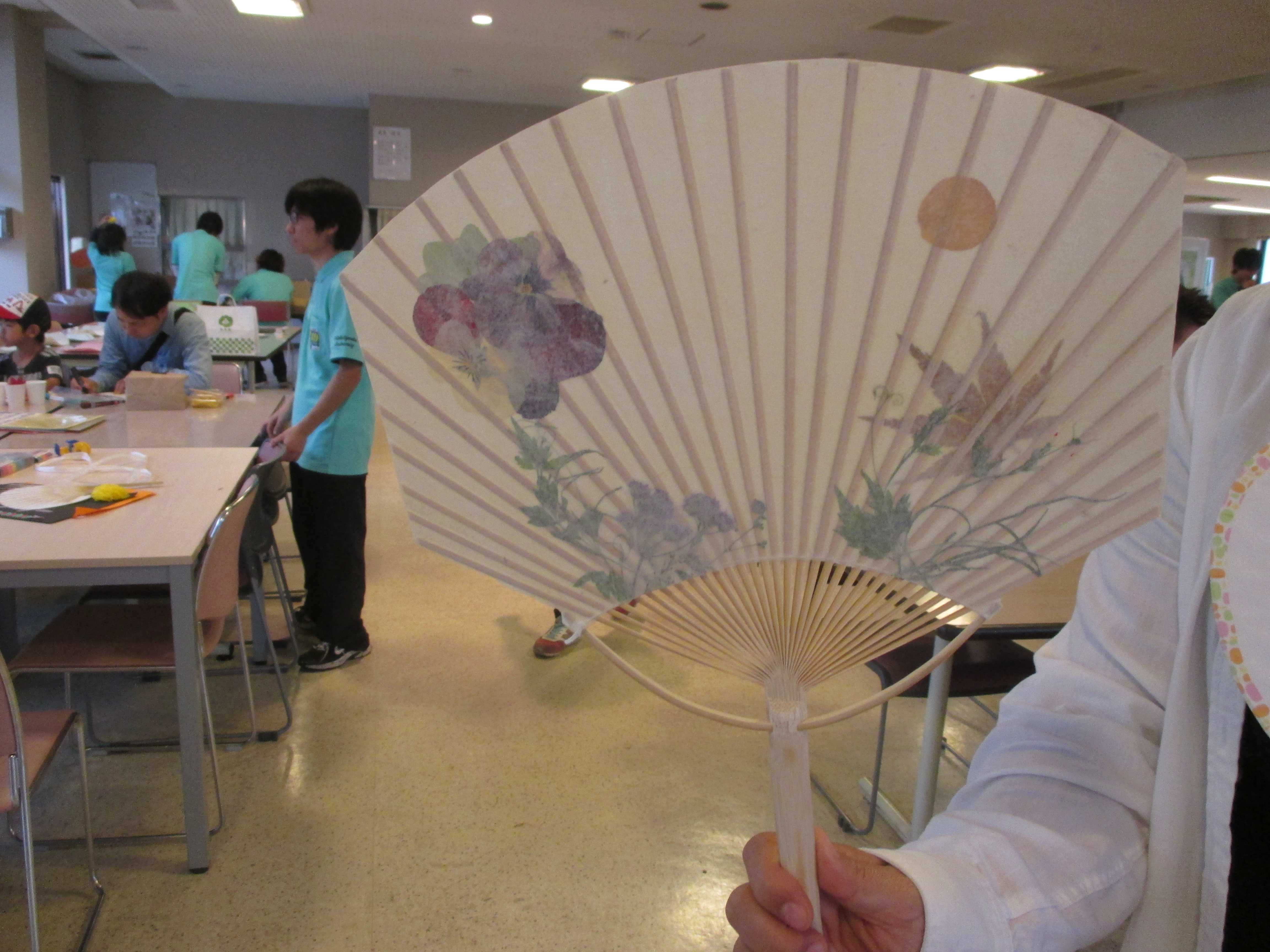 うちわ作り体験では、宮城県石巻市雄勝町の雄勝ローズファクトリーガーデン(雄勝花物語)より送っていただいた押し花を佐賀市の名尾和紙工房の和紙にはさみ、素敵なうちわをみなさん、作っていました