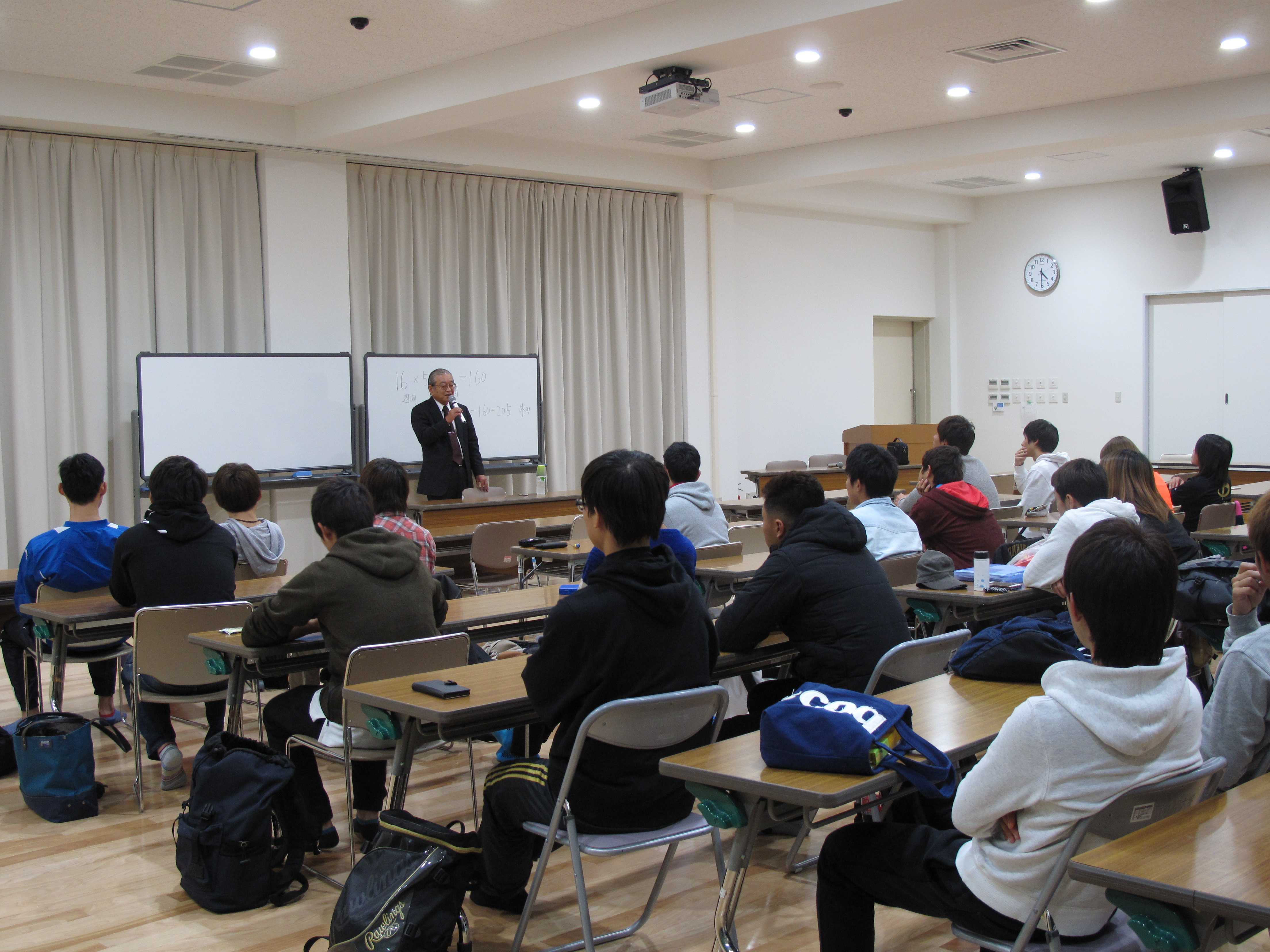 本学科の学生は、将来高等学校教諭・中学校教諭を目指す学生が多く在籍しています。その学生たちに、自分の将来を具体的に思い描いてもらうために、講話を開催しました。講師は、高校教員を長く勤められた先生をお迎えし、教員の仕事内容ややりがい、採用試験や大学時代に取り組んでおいた方が良い事など、大変詳しくお話を頂きました。この講話を聴いて、学生が自分の夢に向かって、さらに頑張ってもらえることを期待しています。