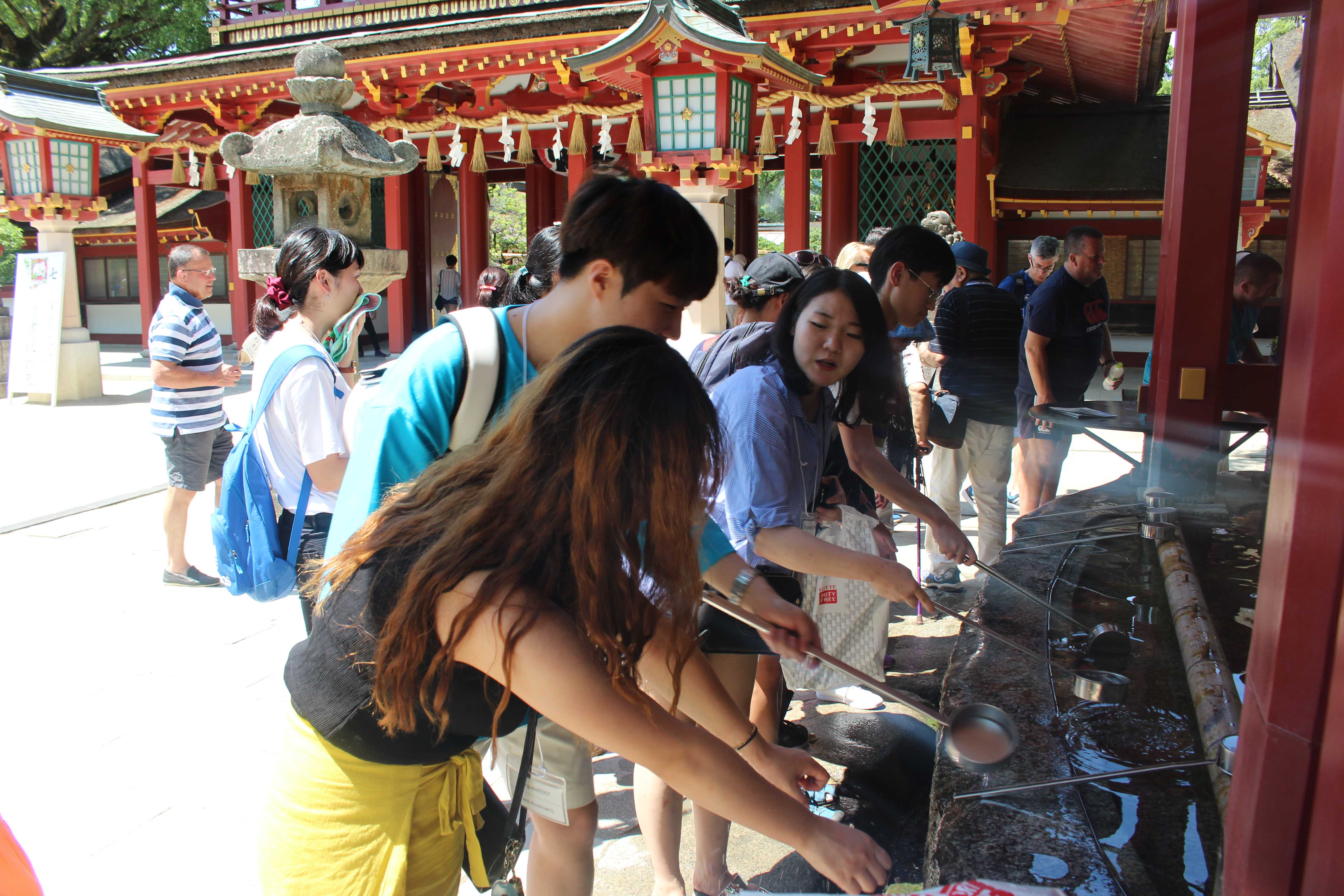 ランチの後は、太宰府天満宮へ参拝です。参拝前には、皆さん、戸惑いながらも手水に挑戦しました