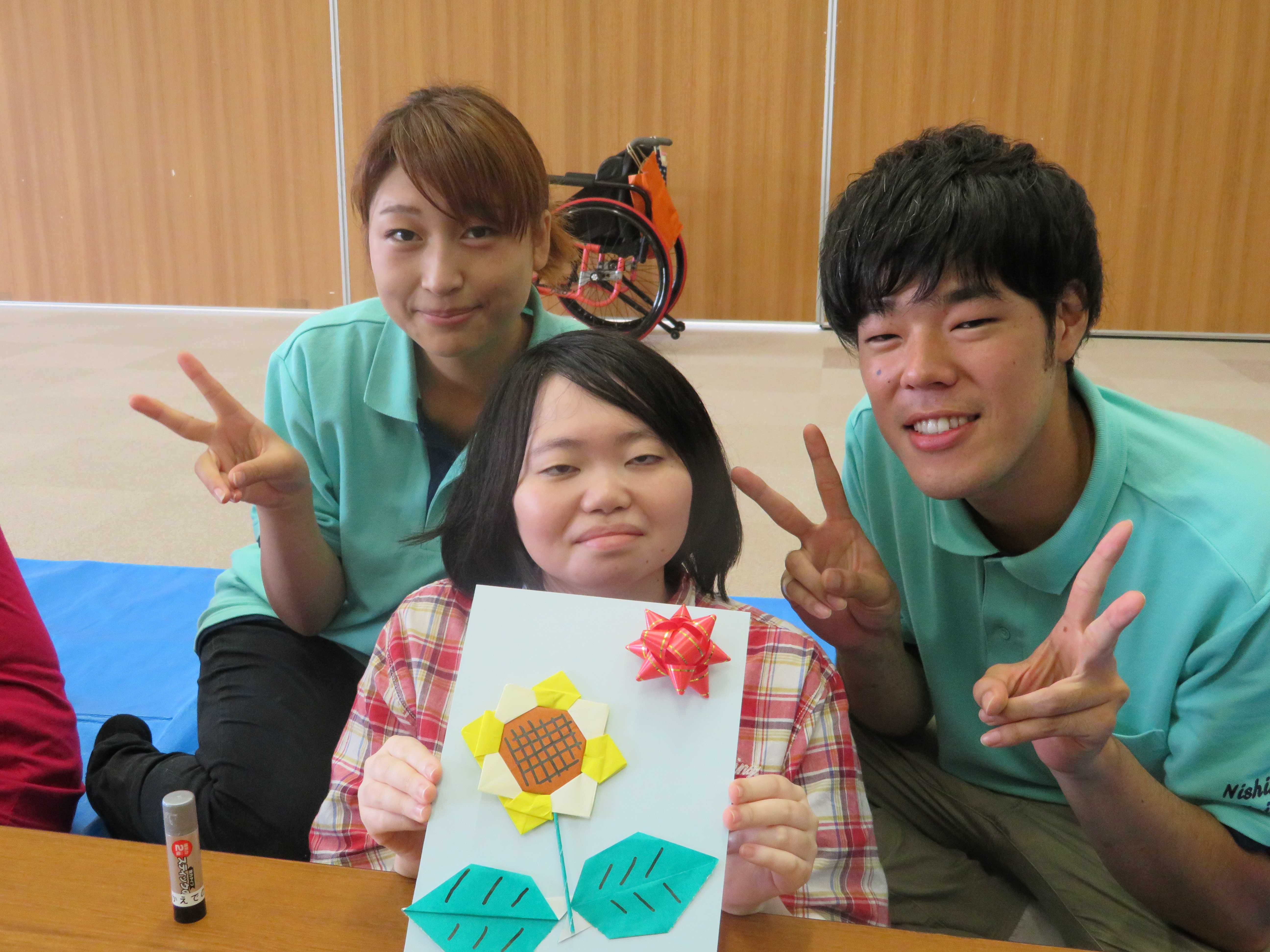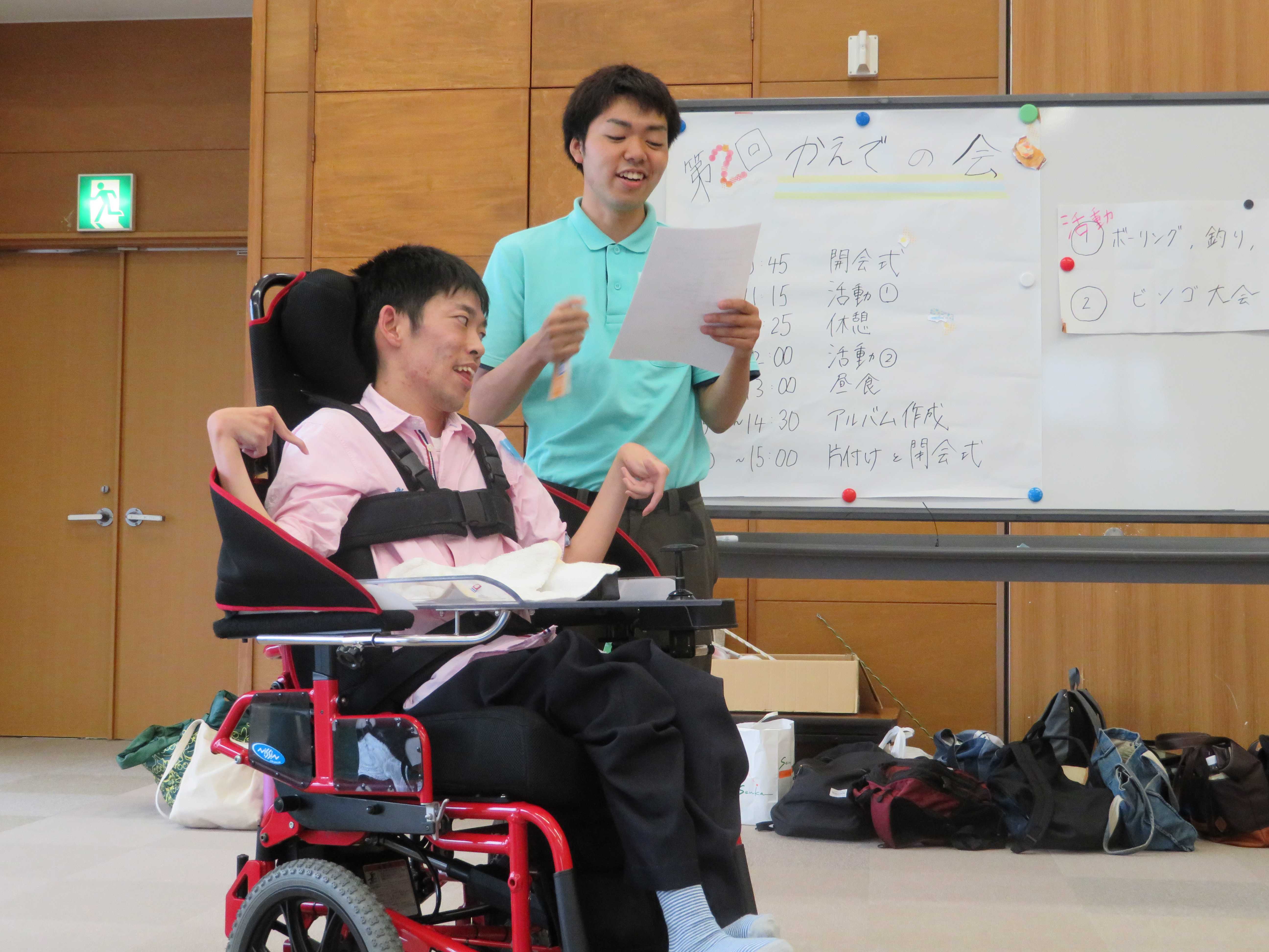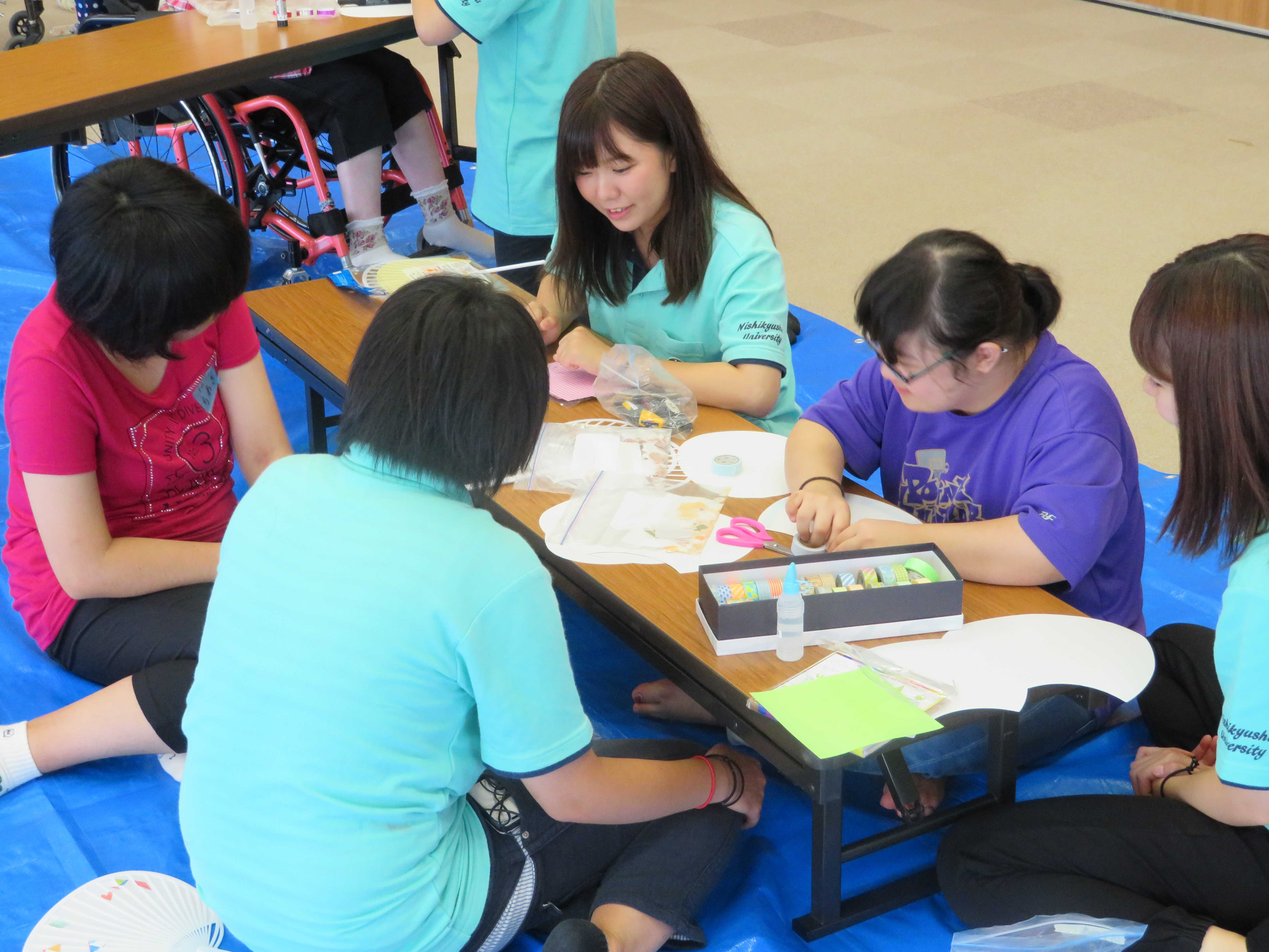 この交流活動は「あすなろう体験Ⅲ」の授業の一環で行っています。「かえでの会」(主として神埼市に在住の障害児・者及びその家族で構成されている当事者団体)と土日の余暇活動を年4回計画しており、今回は第2回の実践活動でした。