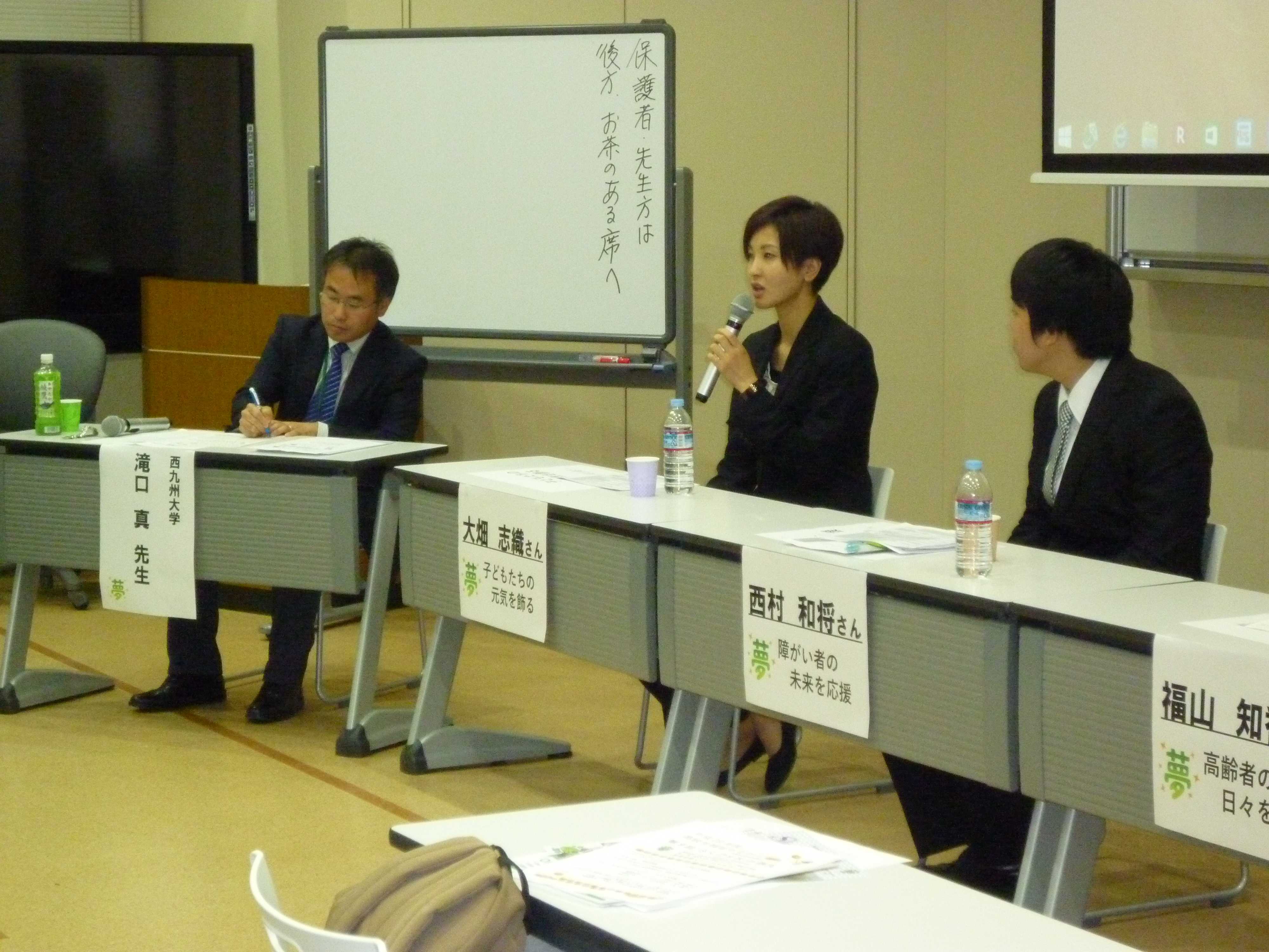 ◆パネルディスカッション「 高齢者・障害者・児童系で働く3人の先輩が 福祉職を選んだきっかけ・進学後の学び・就職後の今、 福祉職の資格とやりがい、将来の展望などについて 熱く語るコーナー 高齢者分野:天寿荘 福山 知香氏 障害者分野:ピア・サポートかだん 西村 和将氏 児童分野 :多良保育園 大畑 志織氏 |
