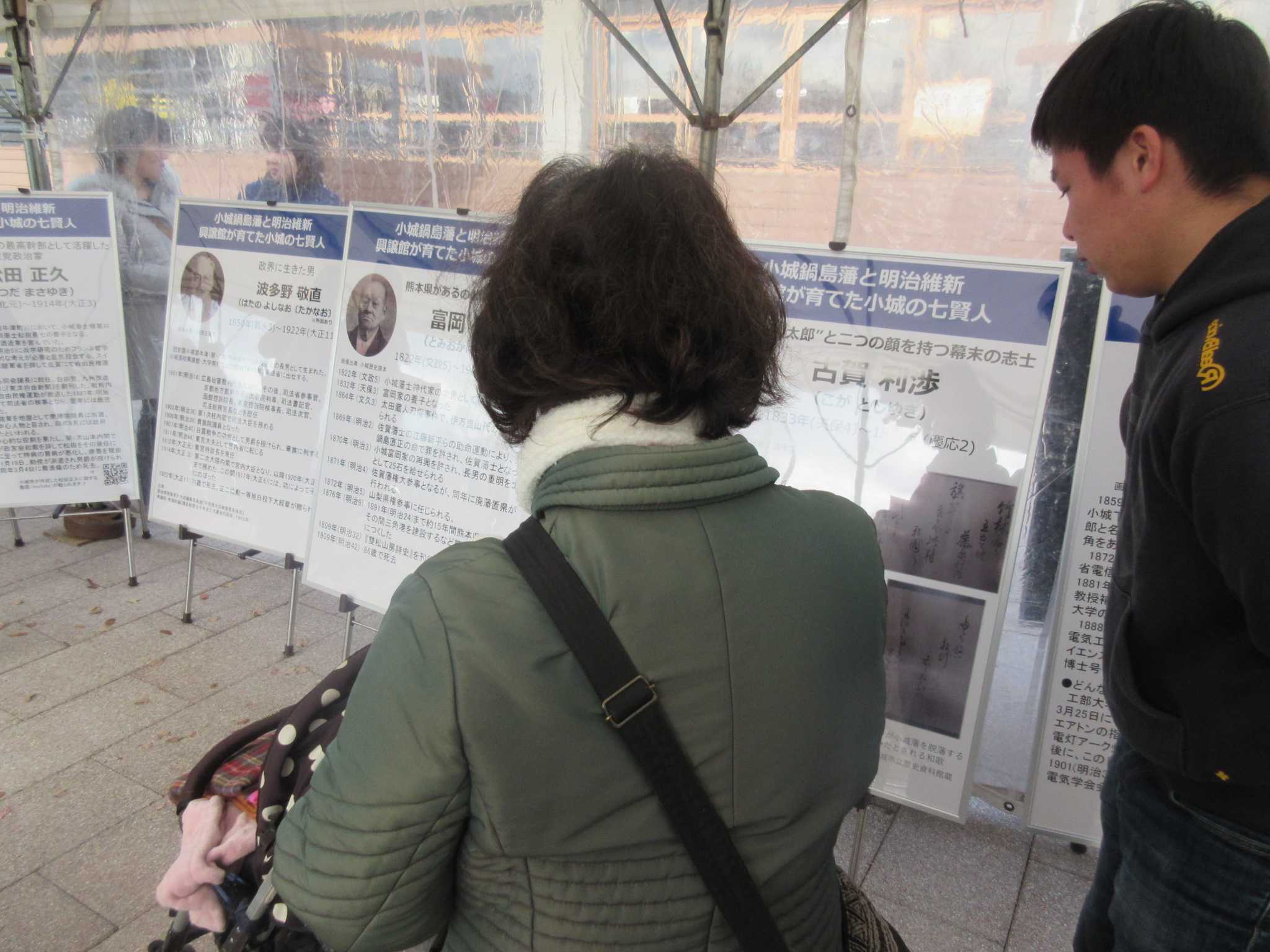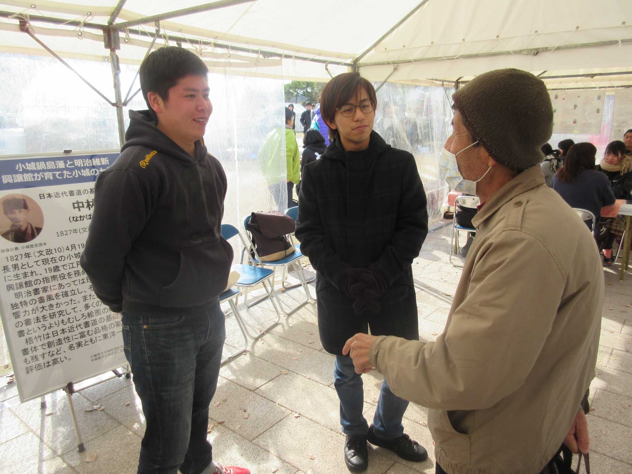 今年一番の冷えこみの中、多くの方にご来場頂きました。はじめは、緊張で話しかけられずにいた学生でしたが、徐々に自分たちが調べた小城の偉人の生い立ちや業績について説明したり、呼び込みのためにチラシを配ったりしていました。