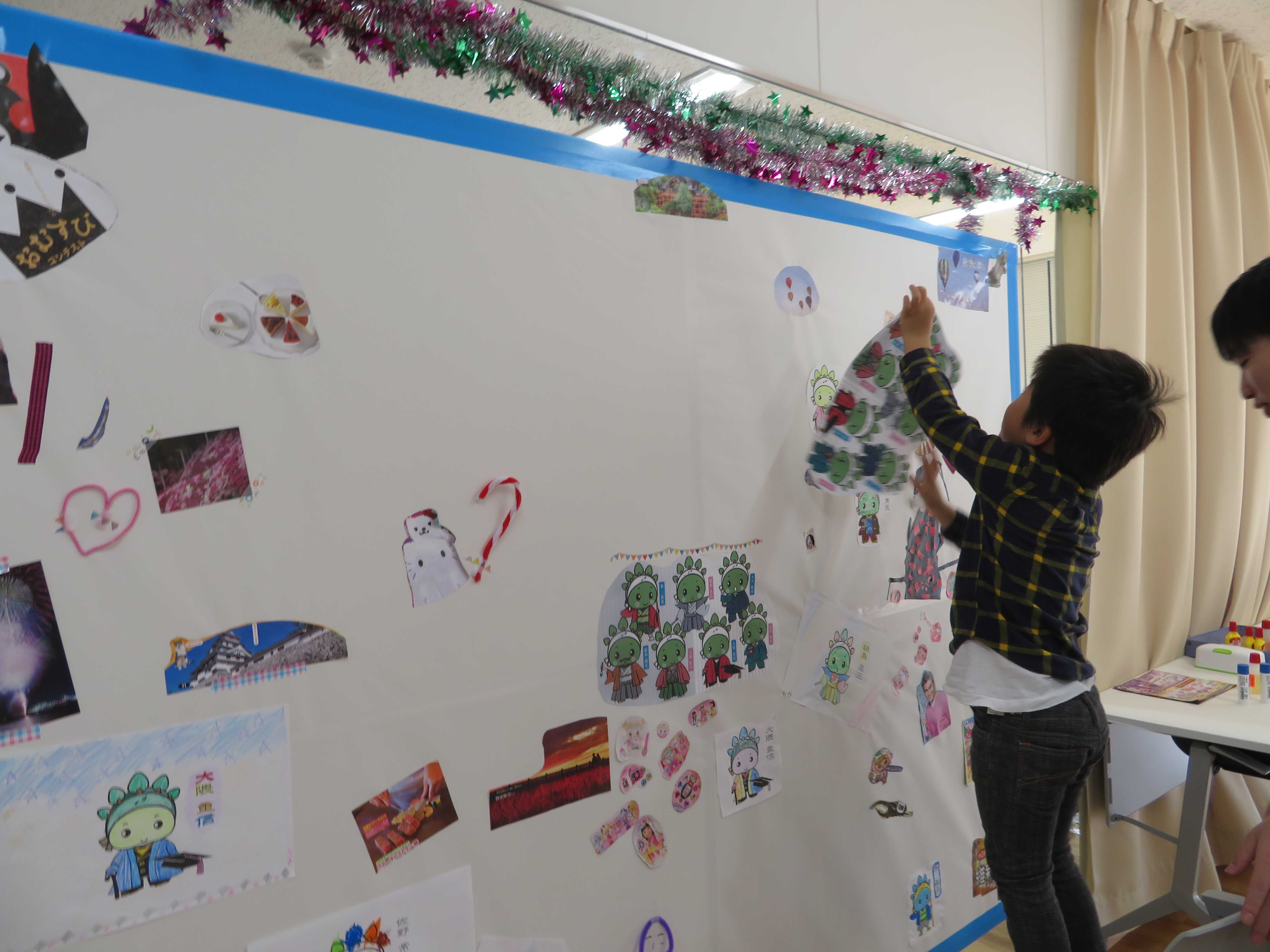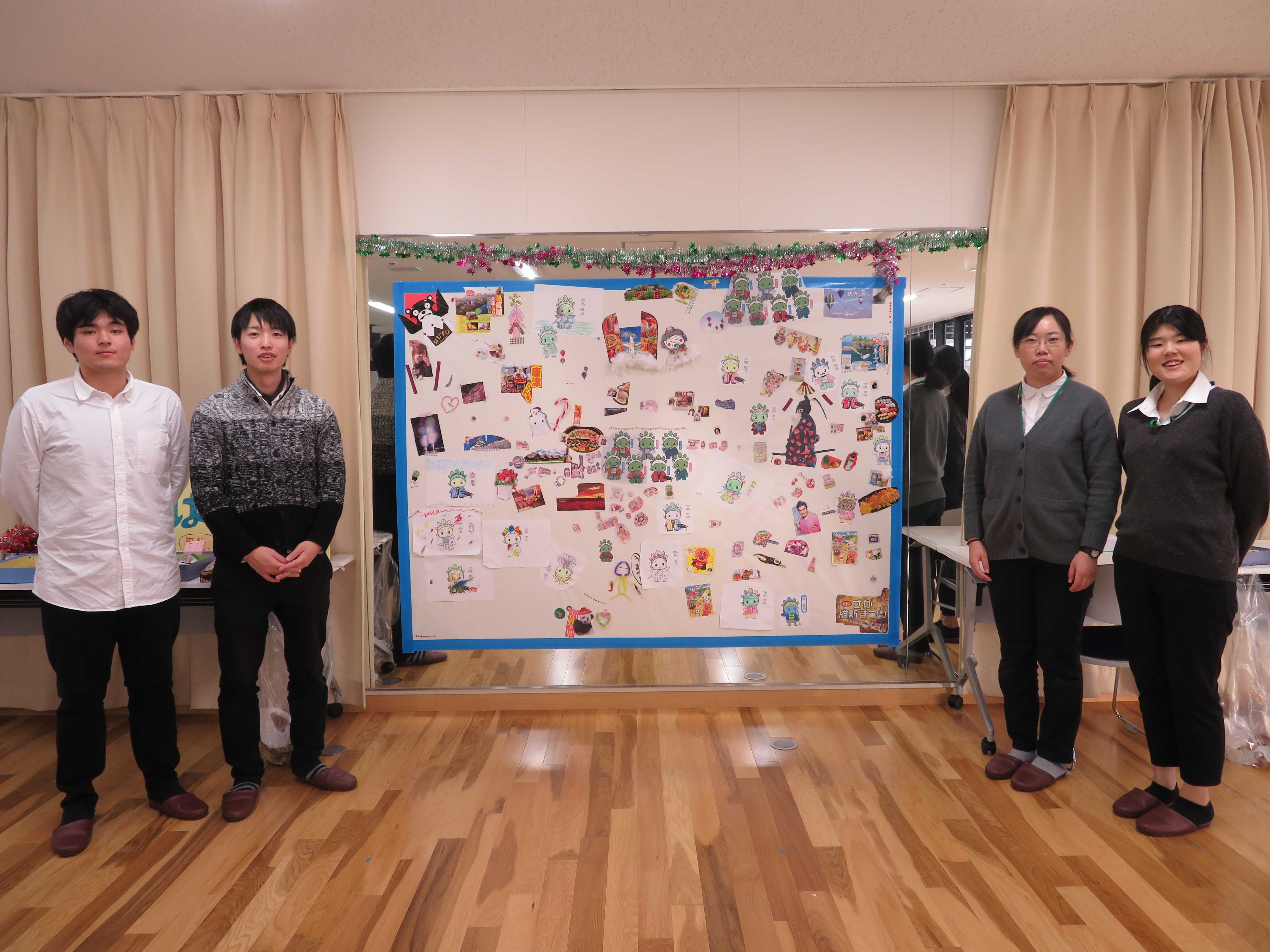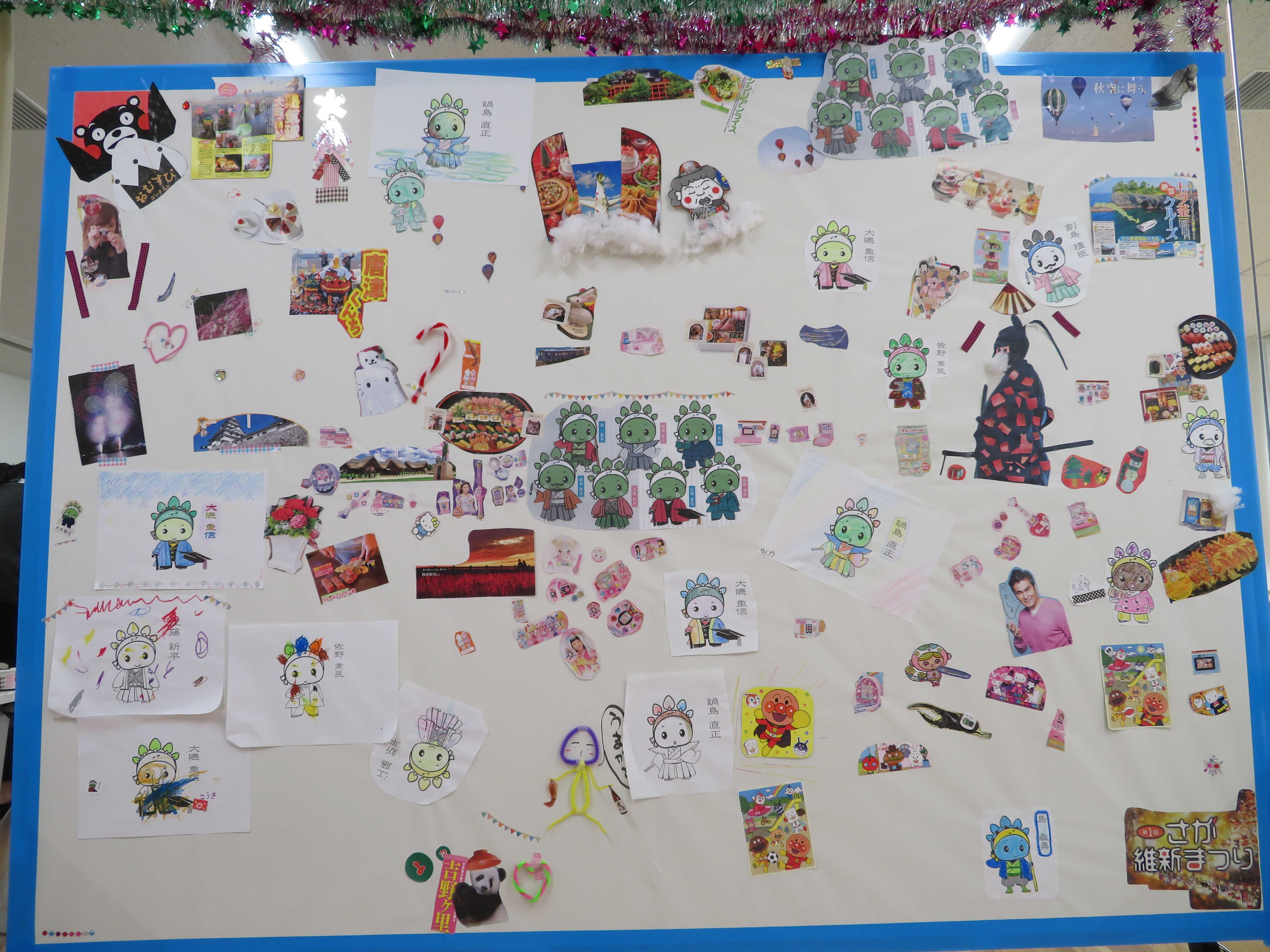 壁一面の大きな模造紙に、佐賀の観光名所や、グルメ、ゆかりの人物などを切り抜いたものを貼っていきます