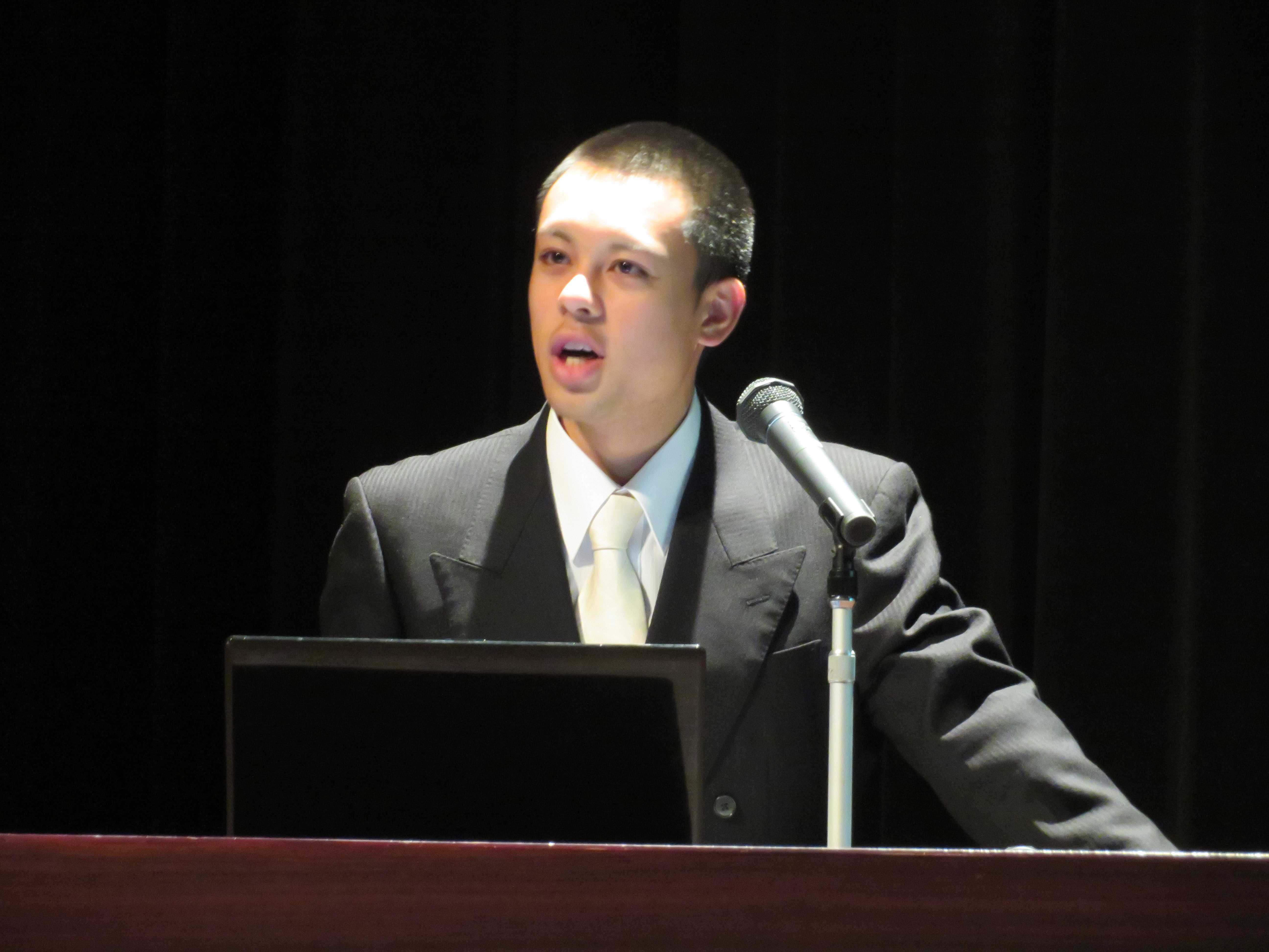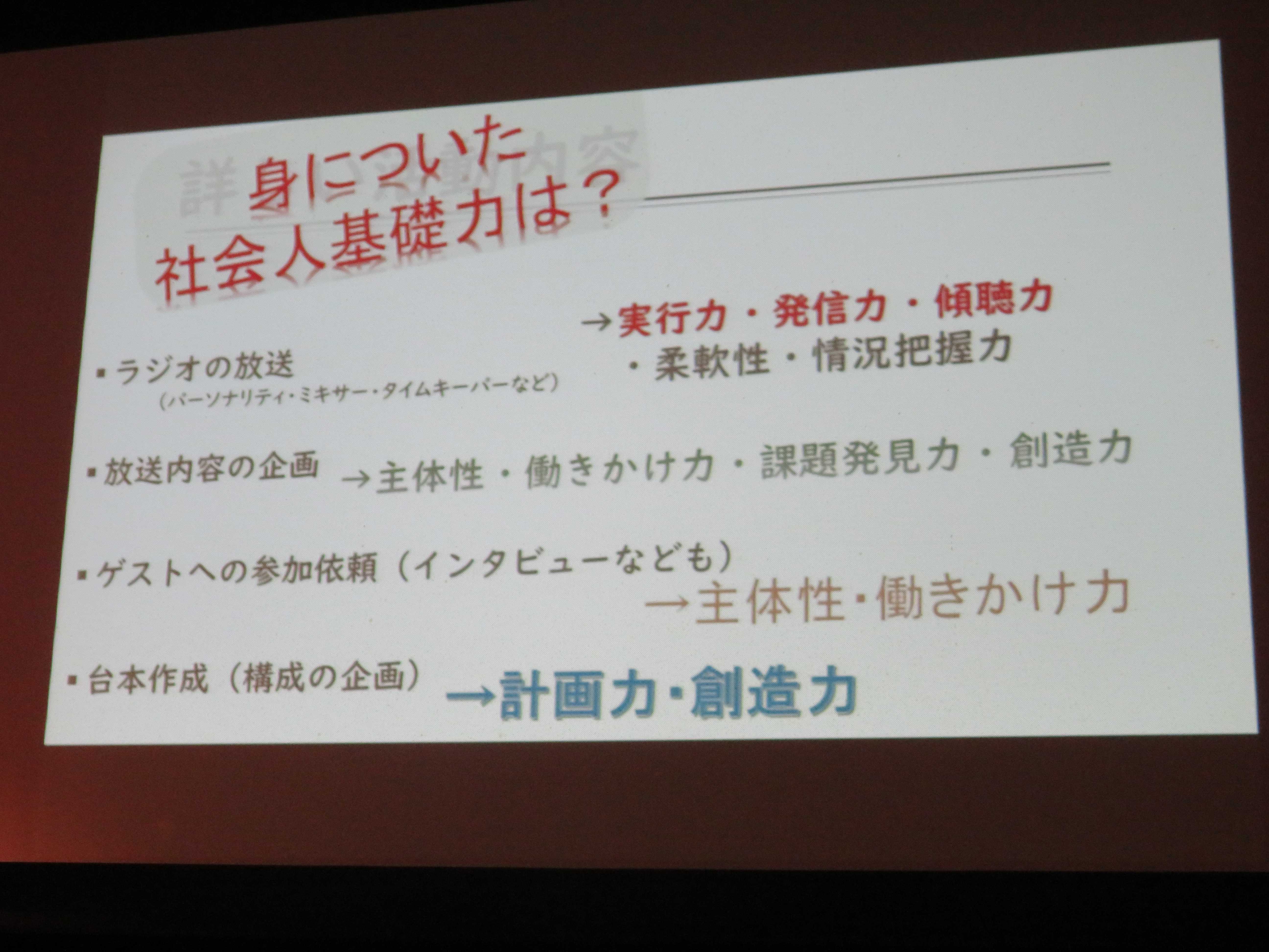 1年生の男子学生は、えびすFMでのラジオパーソナリティでの活動について発表していました