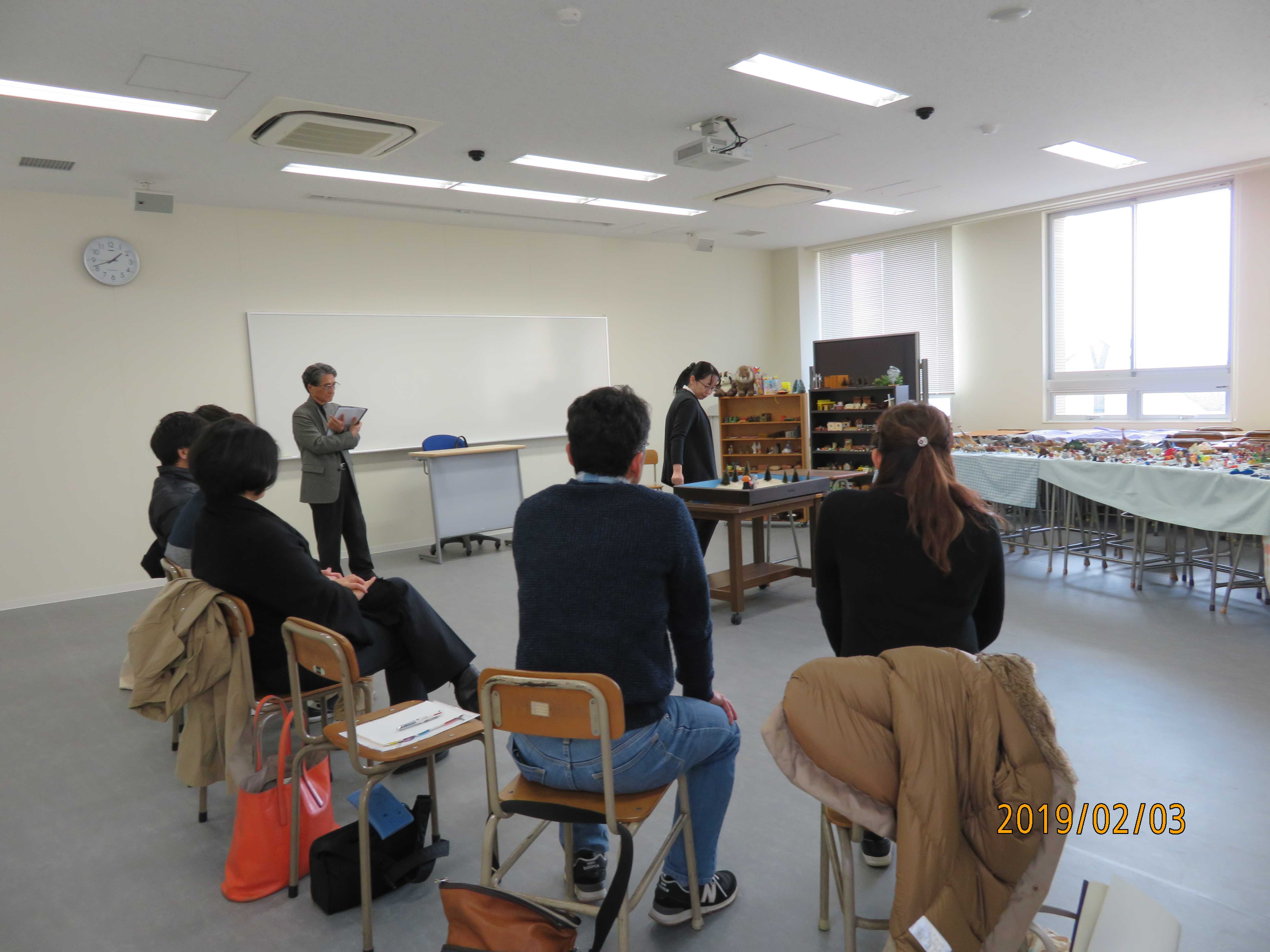 2019年2月2日(土)日本箱庭療法学会主催の「九州・沖縄地区箱庭制作実習研修会」が本学で開催された。3名の講師によるレクチャーと制作体験を3グループに分かれ行われた。参加者は九州各地(福岡、熊本、佐賀、長崎、宮崎)からの参加で、30分ほどかけて箱庭制作を行い、制作後シェアリングをし、みんなの思いを拾い上げ話し合いが行われた。