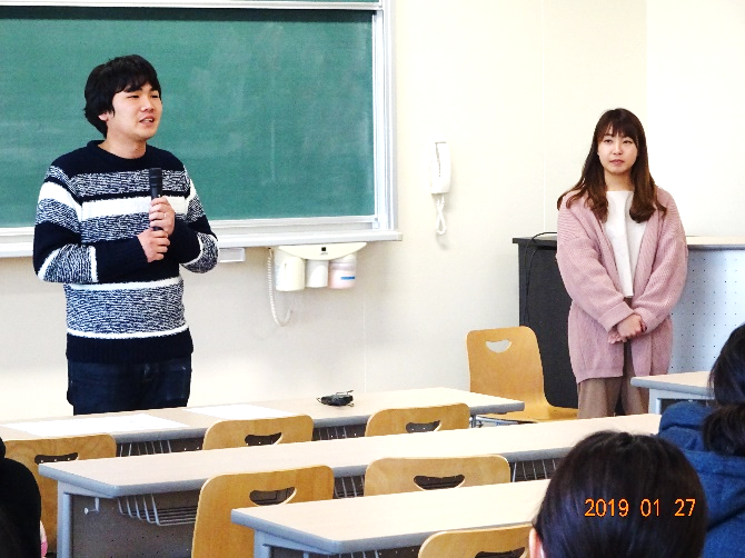 今回も、昨年度に引き続き、子ども発達支援士プログラムのOB・OGとして社会で活躍している坂元美帆さん(保育所勤務、子ども学科卒、写真右)、米田 練さん(障害者施設勤務、幼児保育学科卒、写真左)にご協力いただき、「先輩子ども発達支援士を交えた交流会(質問会)」を行いました。