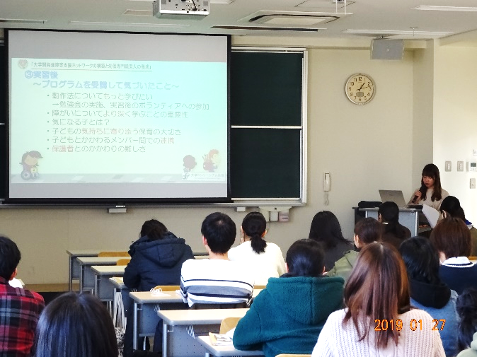 2019年1月27日(日)、西九州大学佐賀キャンパスにて、子ども発達支援士※(基礎)プログラムのコア科目「子どもの支援Ⅰ(基礎・実習)」の後半基礎ユニット(後期集中講義)が西九州大学子ども学部、西九州大学短期大学部幼児保育科合同で開催され、2大学合わせて43名の学生が参加しました。