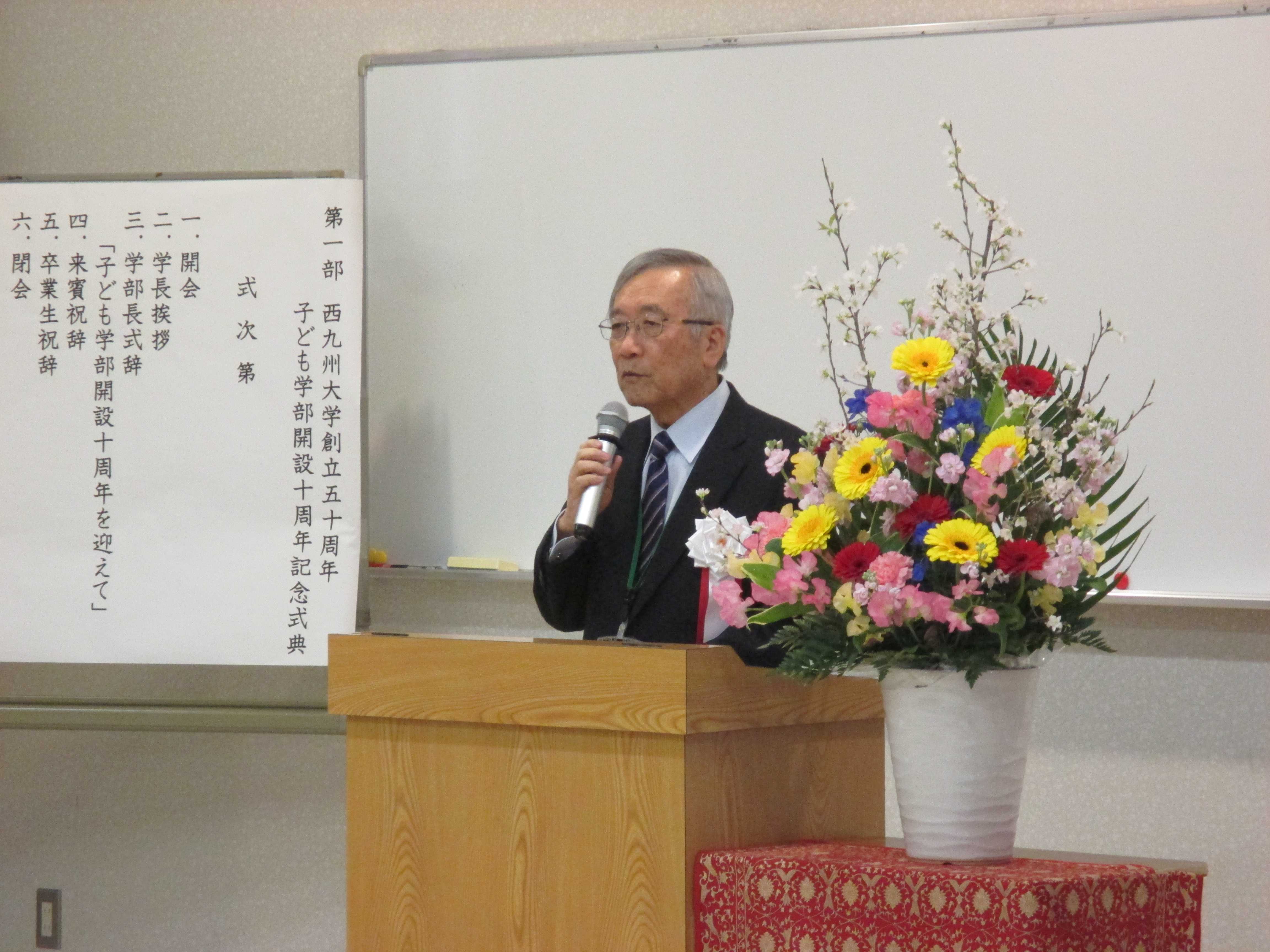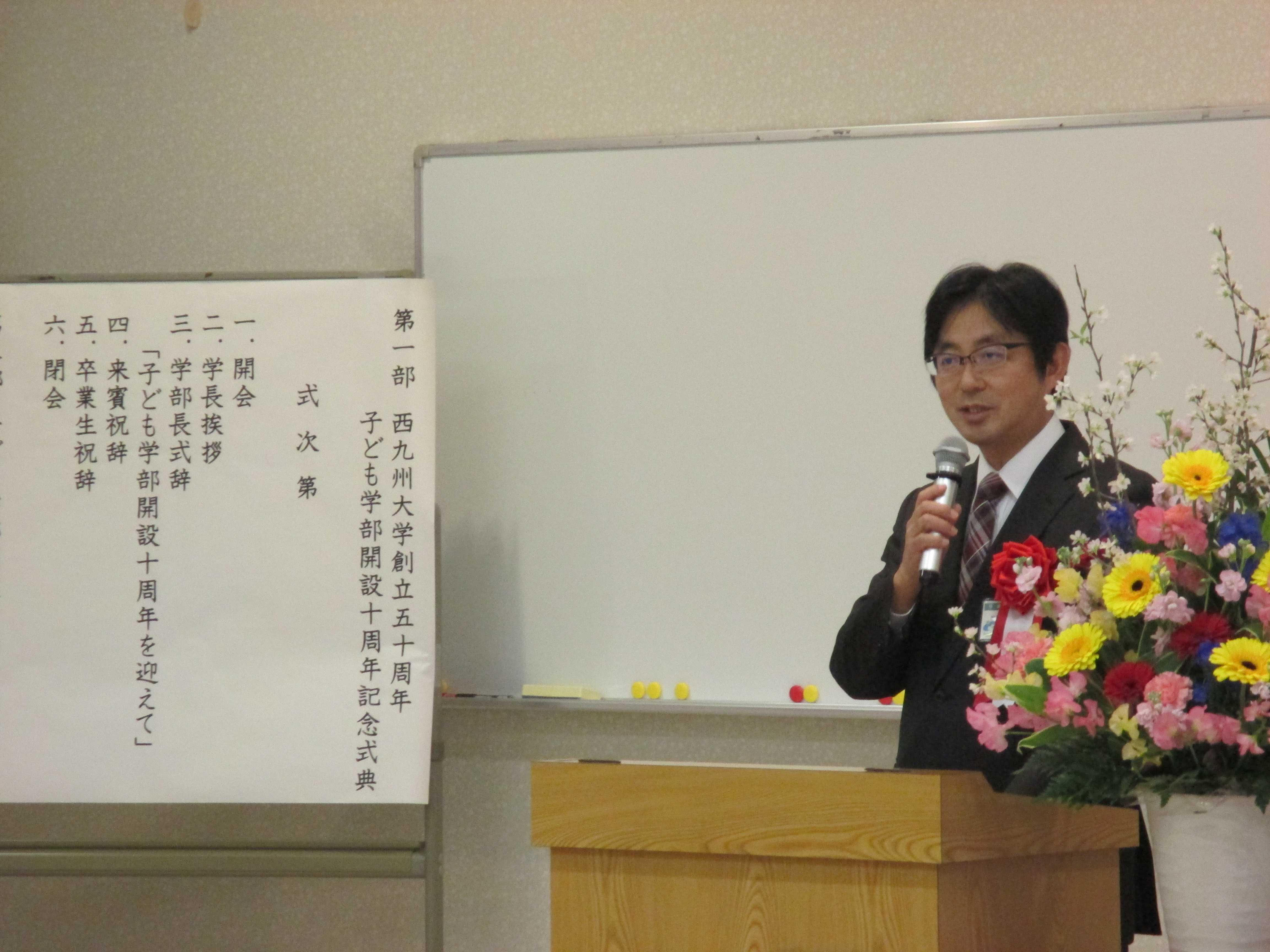 第1部は、記念式典です。学長、学部長の挨拶があり、佐賀市教育委員会、卒業生代表からのご祝辞をいただきました。