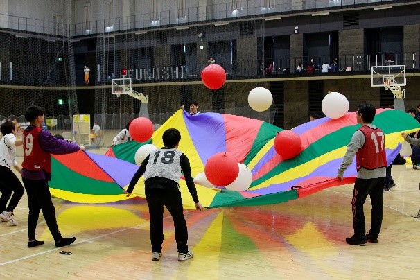 両大学から日頃の活動や参加メンバーの紹介、レクリエーションによって緊張をほぐした後、4つのグループに分かれてジャンボボールとパラバルーンを使ったユニバーサルスポーツ(障がいの有無に関わらず、難しくなく、安全で、楽しむことのできる)のプログラムづくりに取り組みました。 3日目の最終日には地元の障がいのある子どもたちを対象に、作成したプログラムを実践しました。