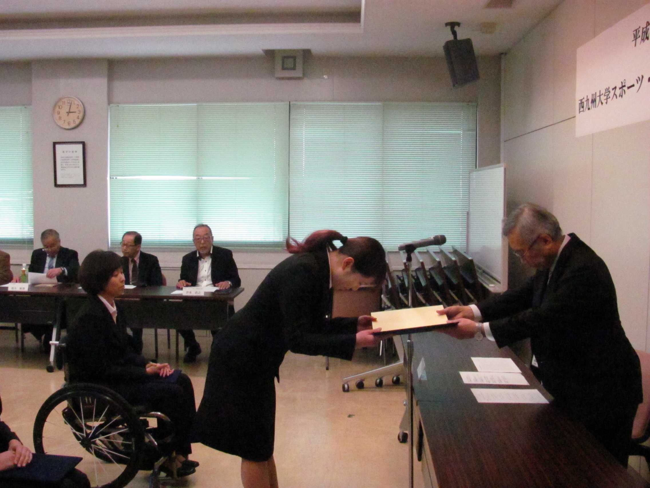西九州大学では、学生の優れたスポーツ・文化の才能を育成し、その競技力・人間性の高揚と学業の両立を促すことを目的として、「スポーツ・文化活動奨励金制度」を設けています。 平成30年度の奨励金支給式が3月11日(月)に執り行われました。 本学科からは個人2名と、本学科の学生が所属する2つの団体の功績が認められ、奨励金が支給されました。