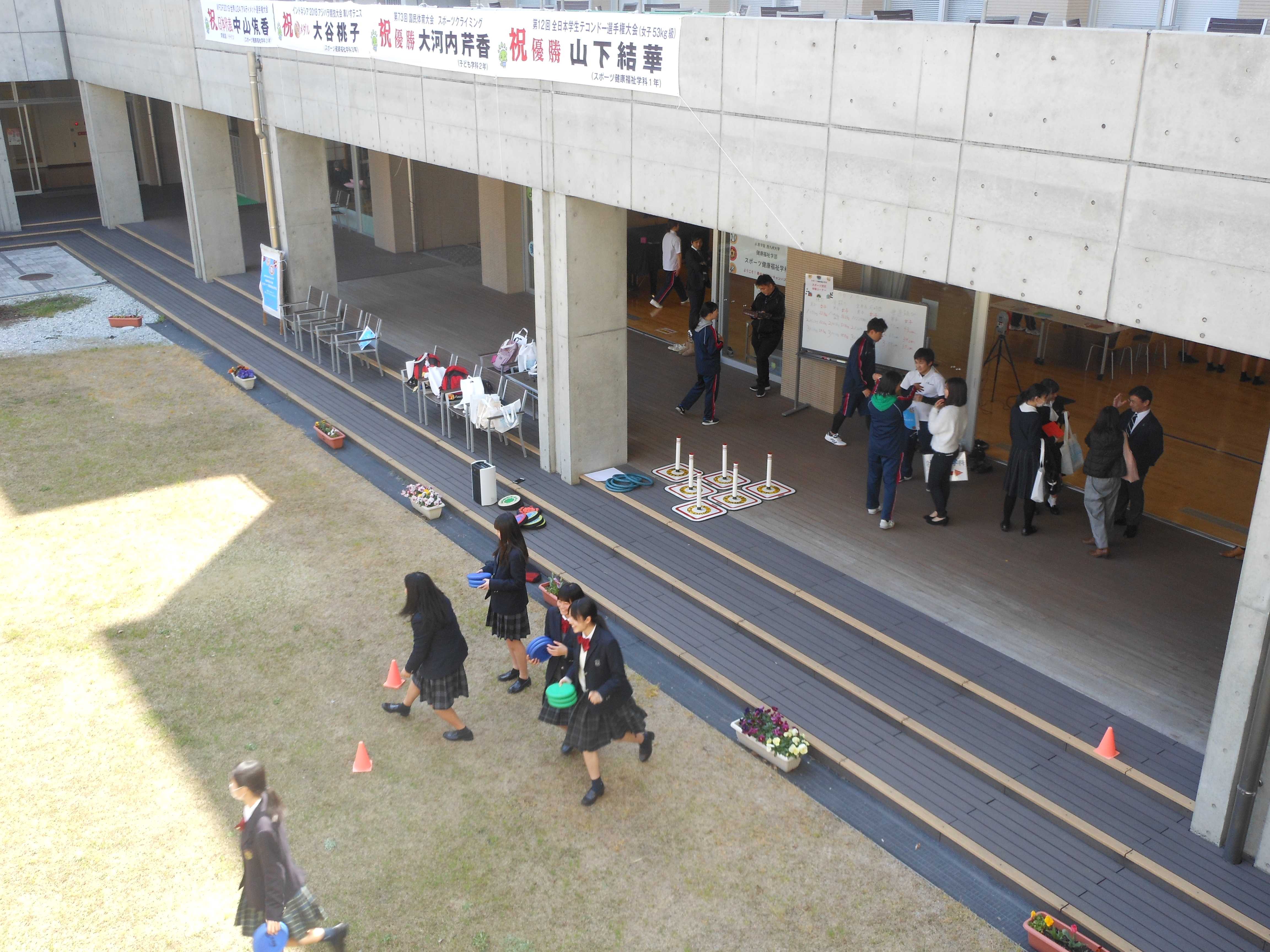 初の試みとなる『春のオープンキャンパス』を3月23日(土)に佐賀キャンパスで開催しました。 今回は西九州大学と短期大学部の合同での開催となり、当日は晴天にも恵まれ多くの方にご来場いただきました。 スポーツ健康福祉学科では、「エアロビクスに挑戦しよう」「最新の筋トレを紹介します」「いろいろなニュースポーツを体験しよう」「あなたの体力・精神力をチェックしてみませんか?」という4つのブースを設け、本学科で学ぶことができる内容について高校生の皆さんに体験してもらいました。