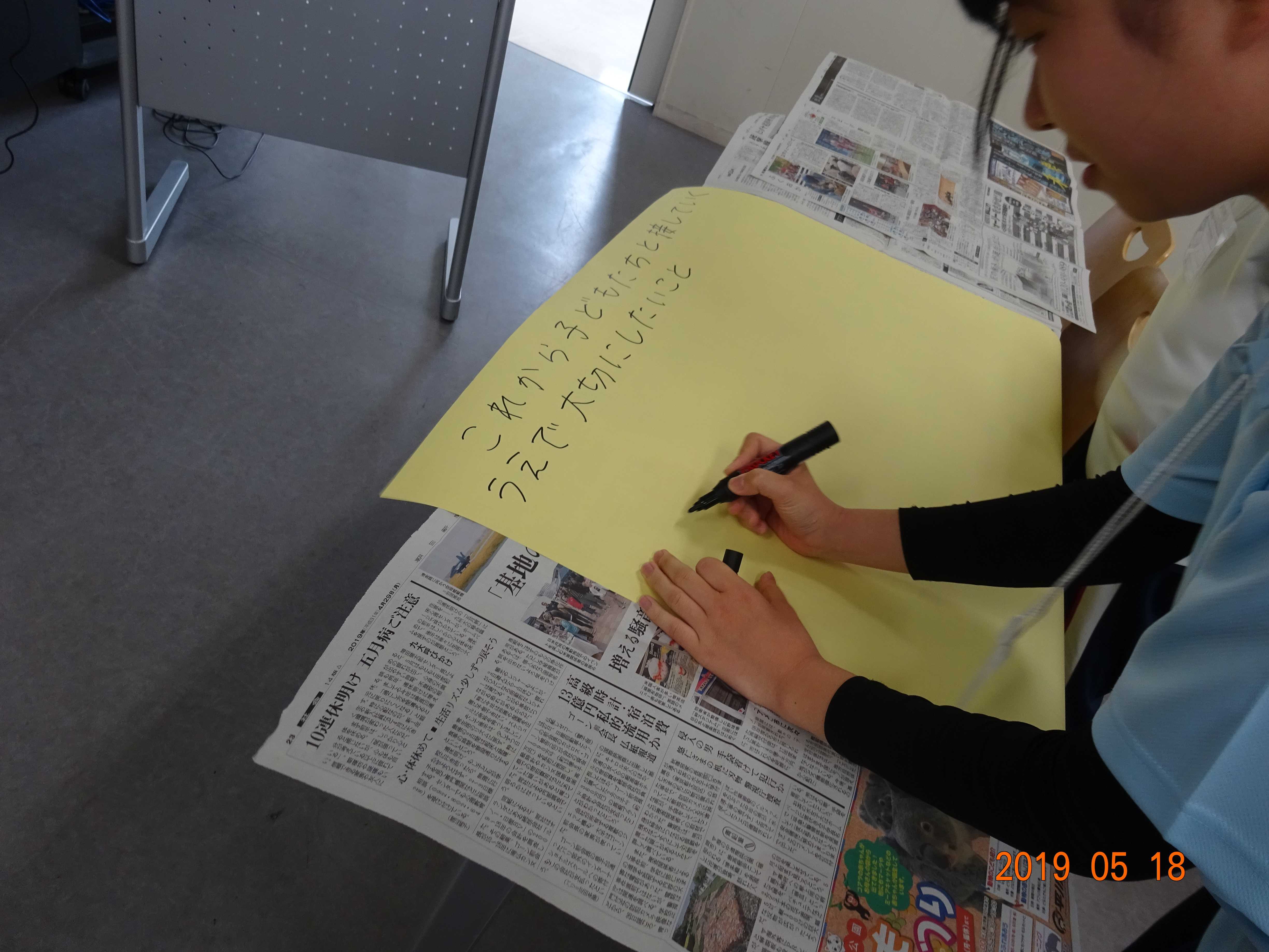 後半は、「これから子どもたちと接していくうえで大切にしたいこと」をテーマに5~6名ずつのグループで、ワークを行いました。お互いの意見を出してまとめ、今後の実習の目標を立てました