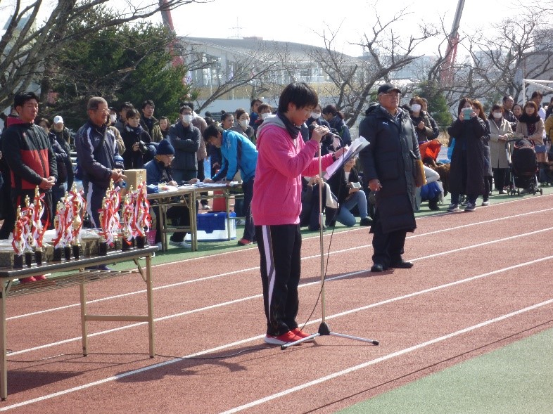 小学生の団員が参加した駅伝大会において、開閉会式や競技中の招集など大会の補助を行いました。