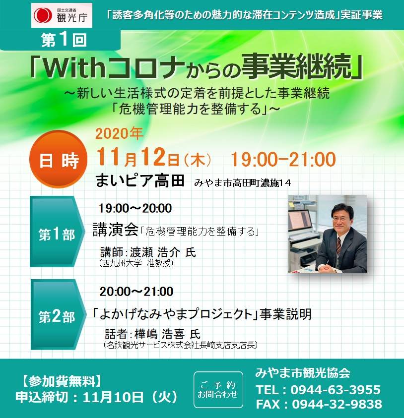 11月12日(木)にみやま市で開催されるセミナーで渡瀬浩介 准教授(スポーツ健康福祉学科)が登壇します。 地域の町おこしに賛同する事業者を対象に、コロナ禍における危機管理の在り方について講演します。