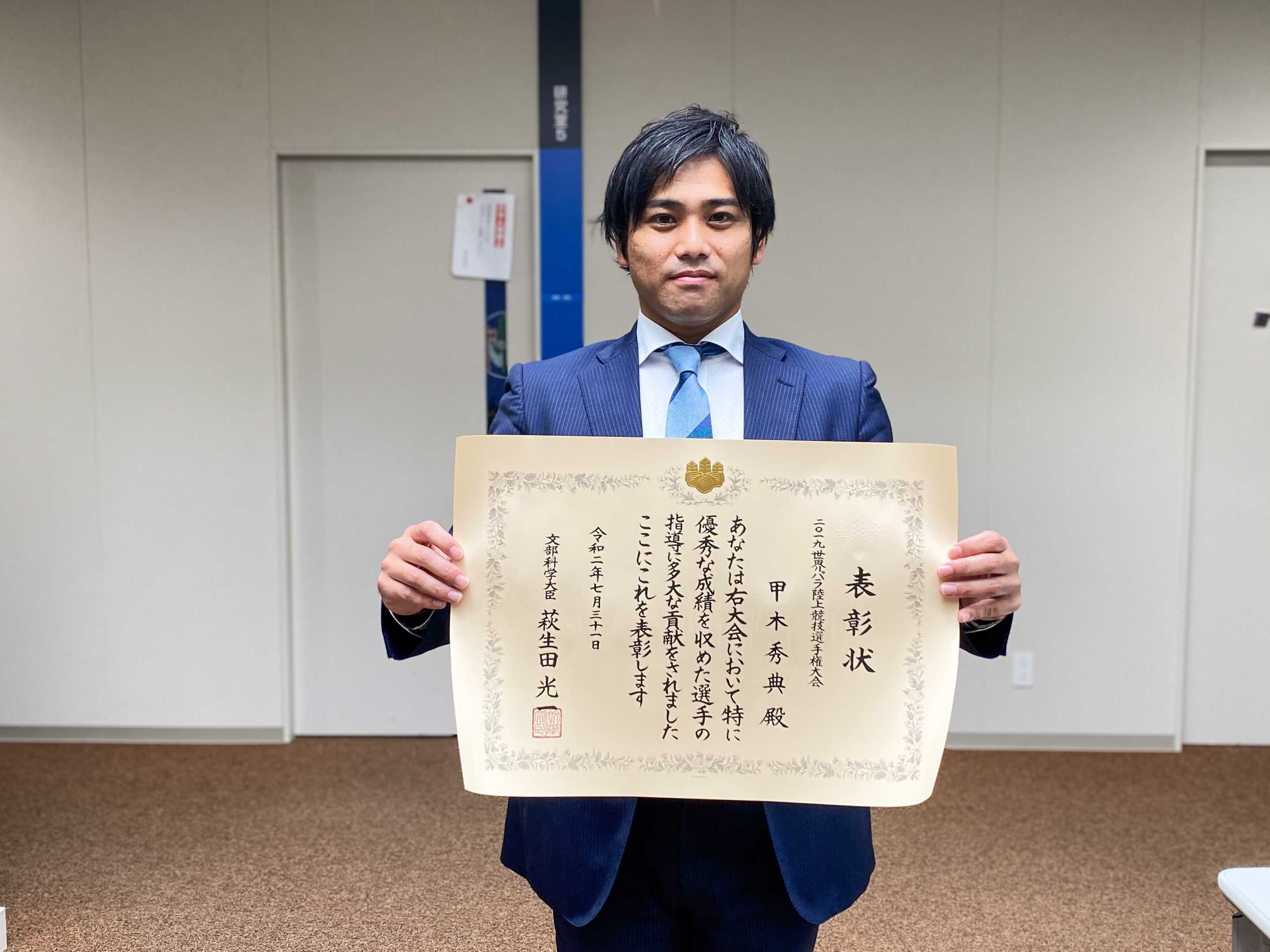この度、令和元年度スポーツ功労者等に係る文部科学大臣顕彰・表彰に、スポーツ健康福祉学科の甲木秀典講師が選ばれました。 この顕彰・表彰は、各競技の世界選手権などにおいて優秀な成績を収めた選手や指導者、支援団体の功績を讃えるものです。 甲木講師は、昨年11月にUAE(アラブ首長国連邦)で開催された「2019世界パラ陸上競技選手権大会」に日本代表選手のコーチとして参加し、選手の身体的・心理的コンディショニングやレース分析などを行い、メダル獲得に貢献しました。