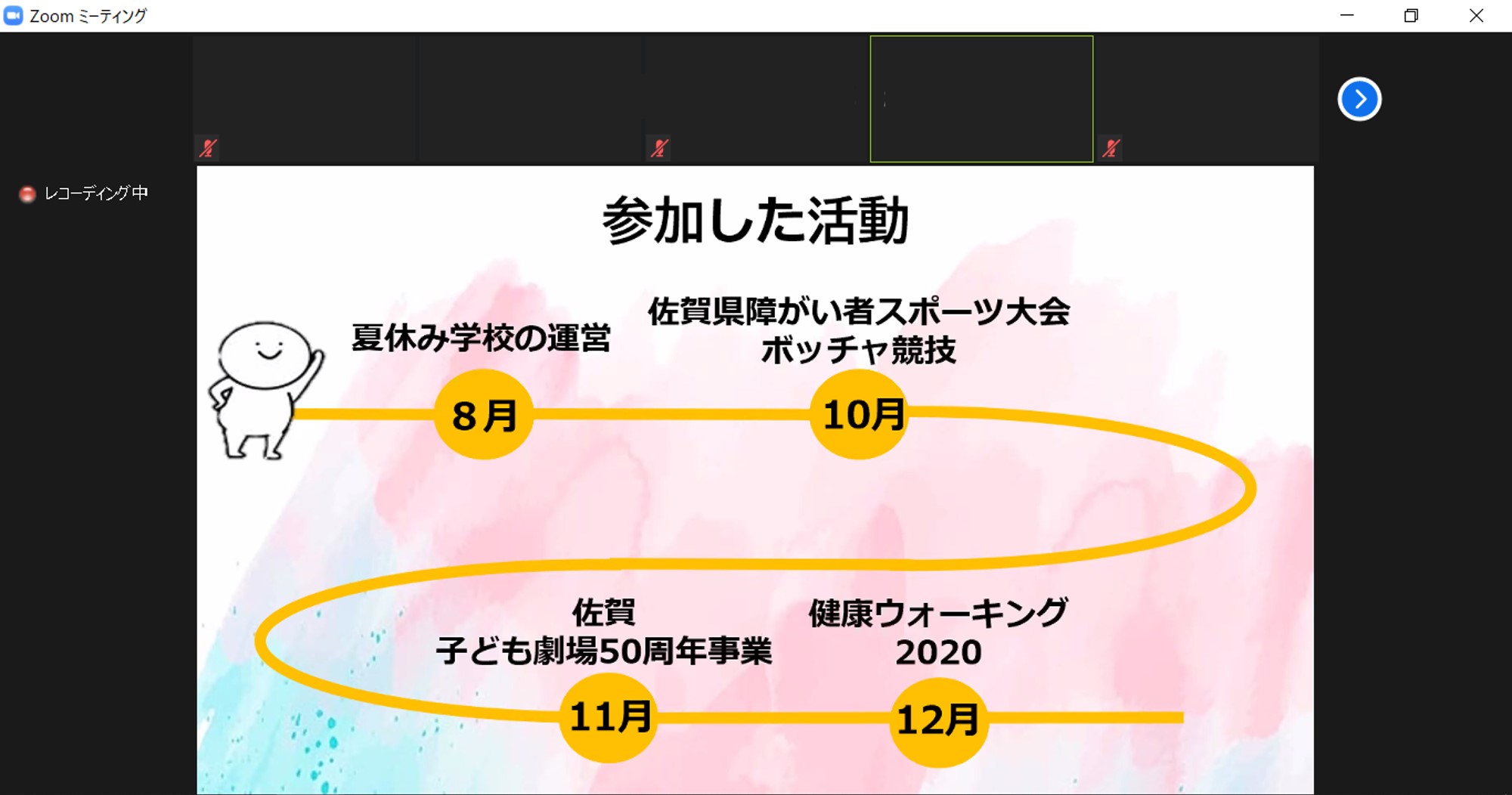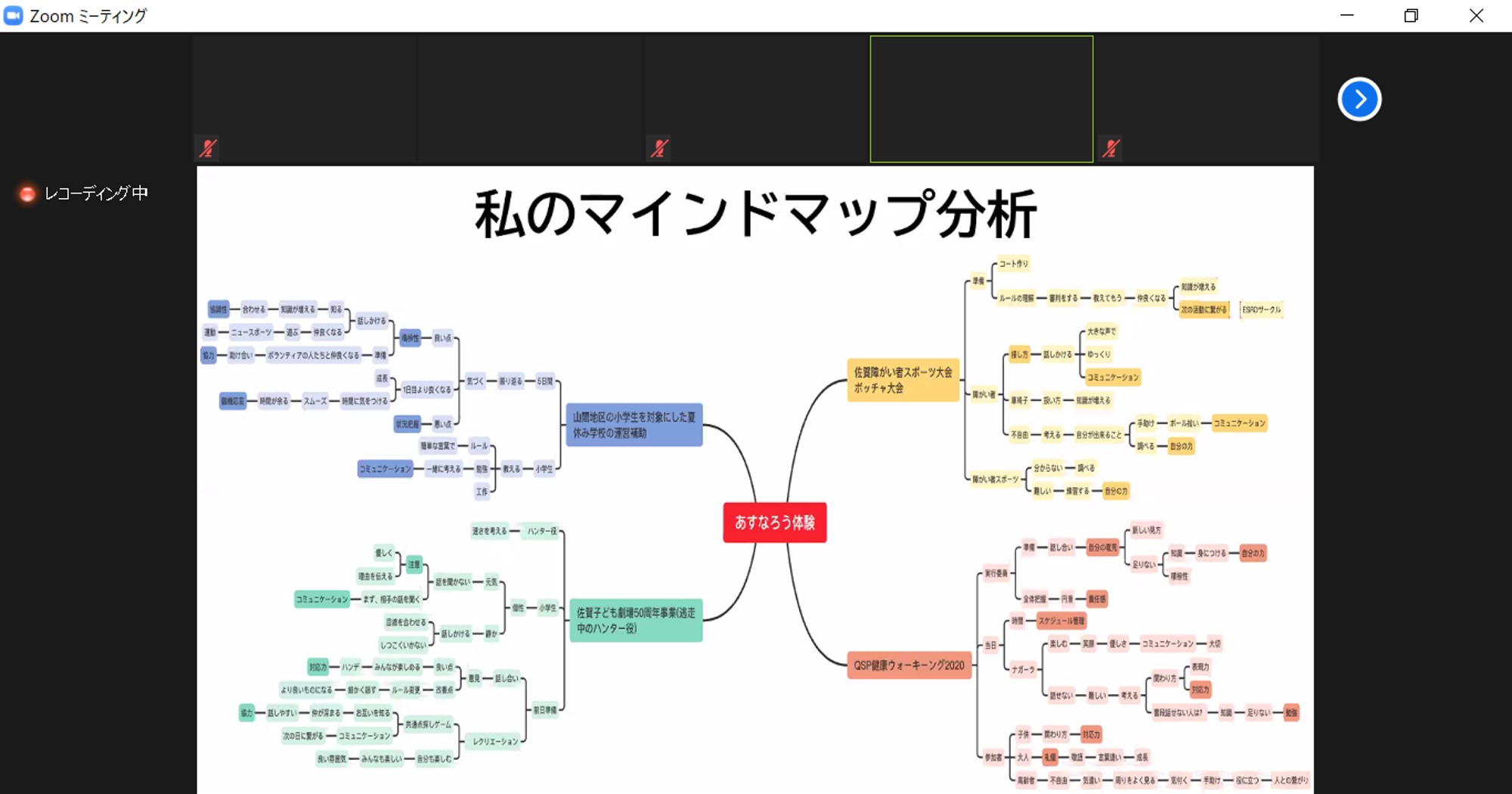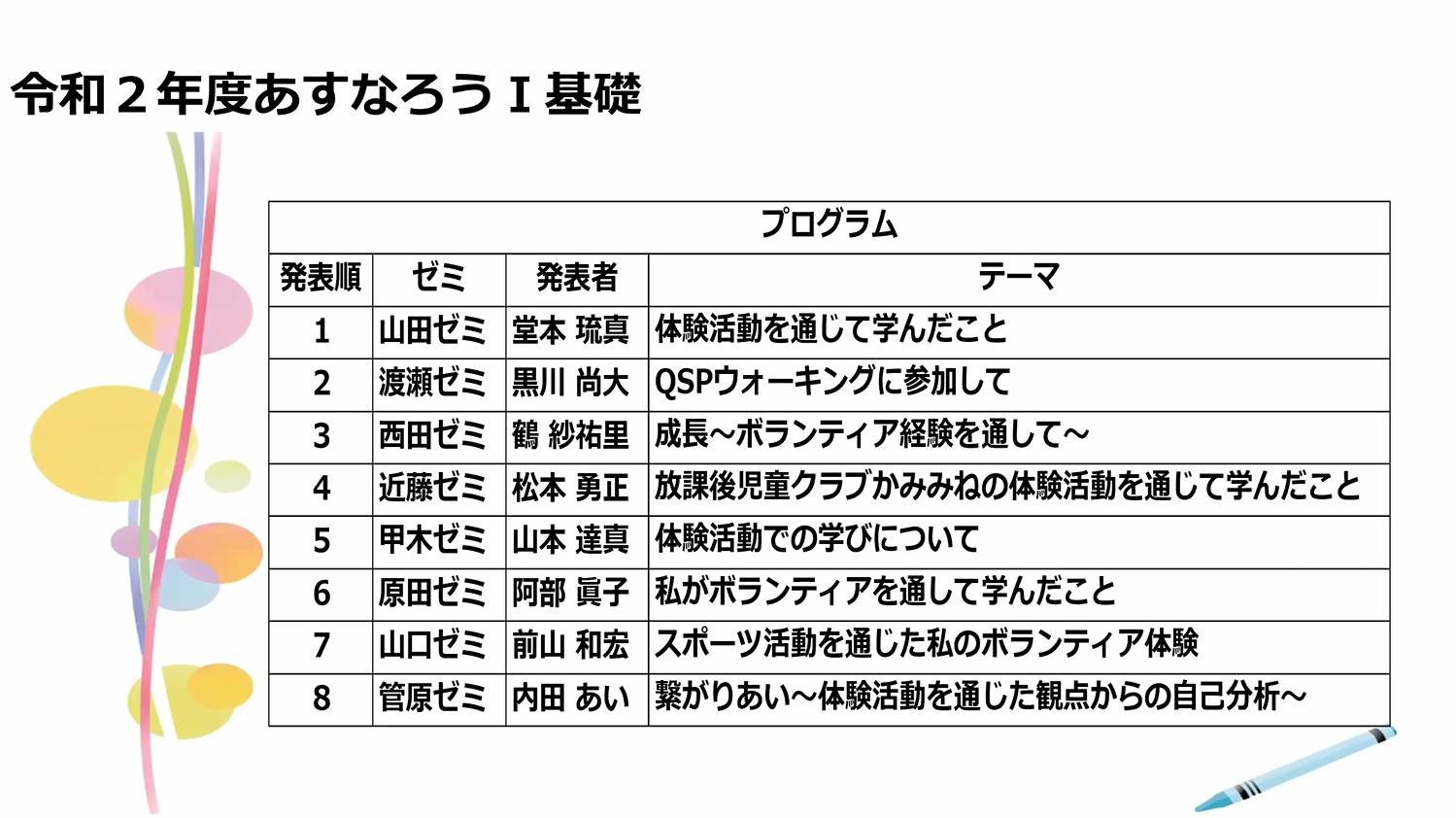 西九州大学の1年生は「あすなろう」精神のもとに、地域での体験活動に携わる必修科目を履修します。 その成果発表の場である『あすなろう体験活動報告会』を、2月9日(火)に開催しました。 例年は全学での対面形式で実施していますが、先日の卒業研究発表会に続きオンラインでの開催となりました。 8つのゼミからそれぞれ選ばれた代表者8名は緊張した様子で、イベント運営などを通して得た学びや気付きについて発表しました。