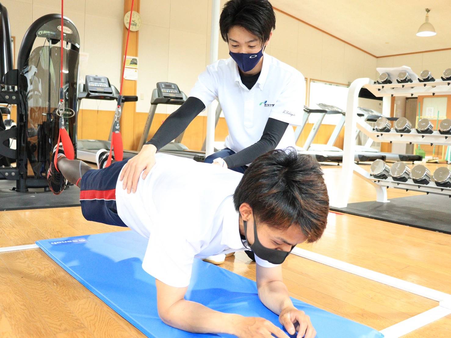 スポーツ健康福祉学科には、在学中に取得可能なスポーツ関連資格があります。例えば、地域スポーツクラブなどでフィットネスの維持や向上のための指導・助言を行う“スポーツプログラマー”や、幼少期の子どもたちに遊びを通した身体づくり、動きづくりの指導を行う“ジュニアスポーツ指導員”などの資格を取得できます。