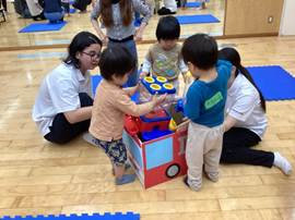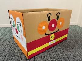 どうやったら、子どもたちが楽しくおもちゃを片付けてくれるだろう」と学生たちが考え、「アンパンマン」と「乗り物」のお片付けボックスを作成しました。そのねらいもばっちりで、楽しく遊んだ後は、自分たちでドンドンお片付けをすることができました
