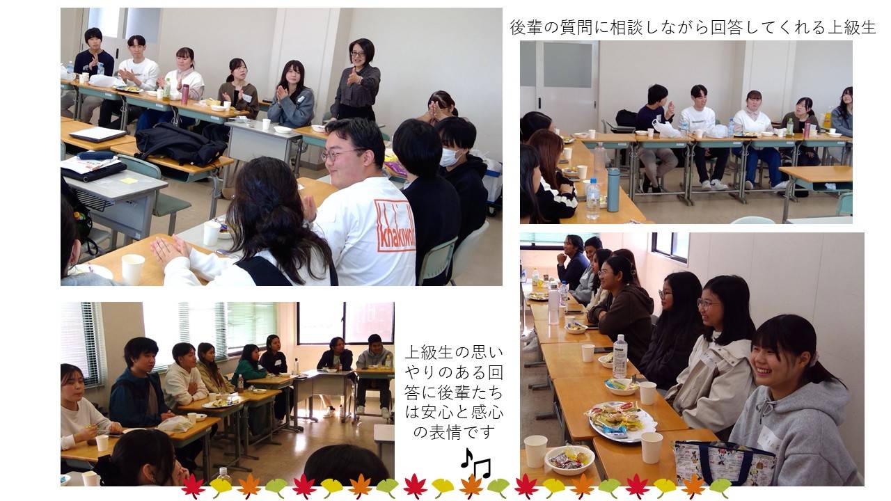 4年生は実習をまとめ、国家試験に向けたラストスパート、2,3年生は春の実習に向けた準備と、年末に向けて慌ただしさが増していきます。充実した日々である一方、授業のこと、実習のこと、それぞれの学年ごとに「不安なこと」「知りたいこと」が異なります。交流を通して顔なじみになり、お互い気軽にサポートし合える関係づくりを目指しています。