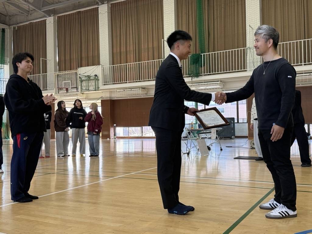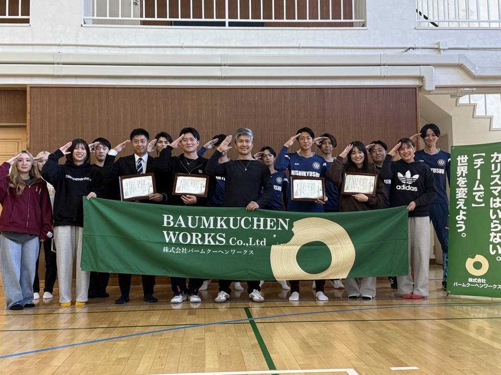 永原学園は令和7年9月に、株式会社バームクーヘンワークスとのスポンサーシップ契約を締結し、スポーツサークルの活動に必要な資金提供を受けることになりました! スポーツ強化指定種目のうち4つのサークル(軟式野球、男子バレー、女子バレー、男子サッカー)がユニフォーム等の物品を支援いただけることになり、11月の学園祭で目録が支給されました。