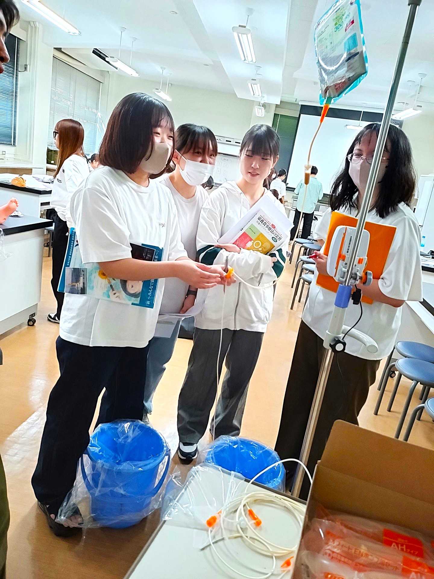 また、経口摂取が出来ない方への経管栄養法の実習、身体の状態(腸の音、心臓の音、肺の音、嚥下音など)をみることについても学びます。学生らは、楽しく実習を行っています。