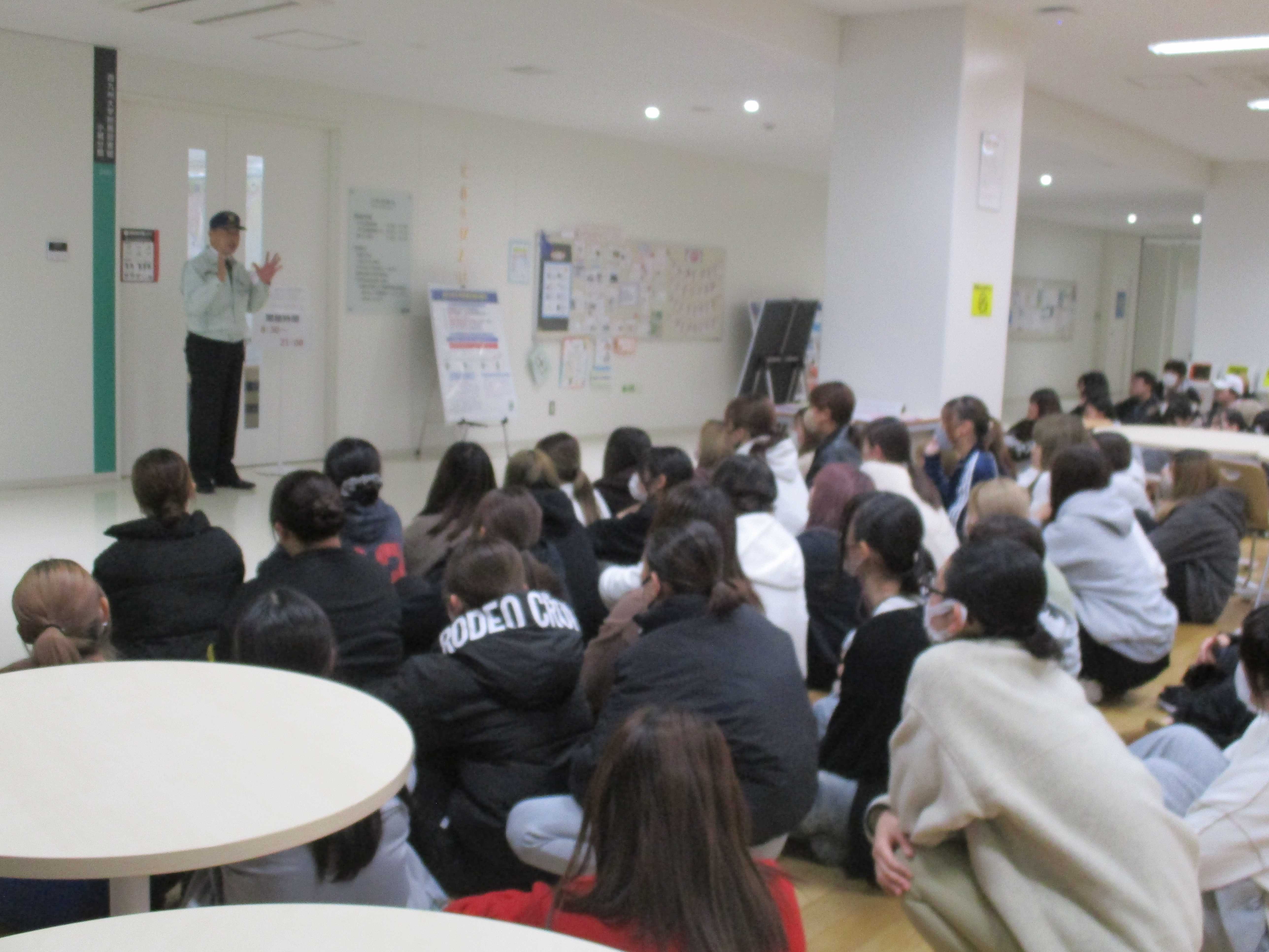 (当日は雨天のため、避難場所を2号館1階学生ホールに変更して実施しました