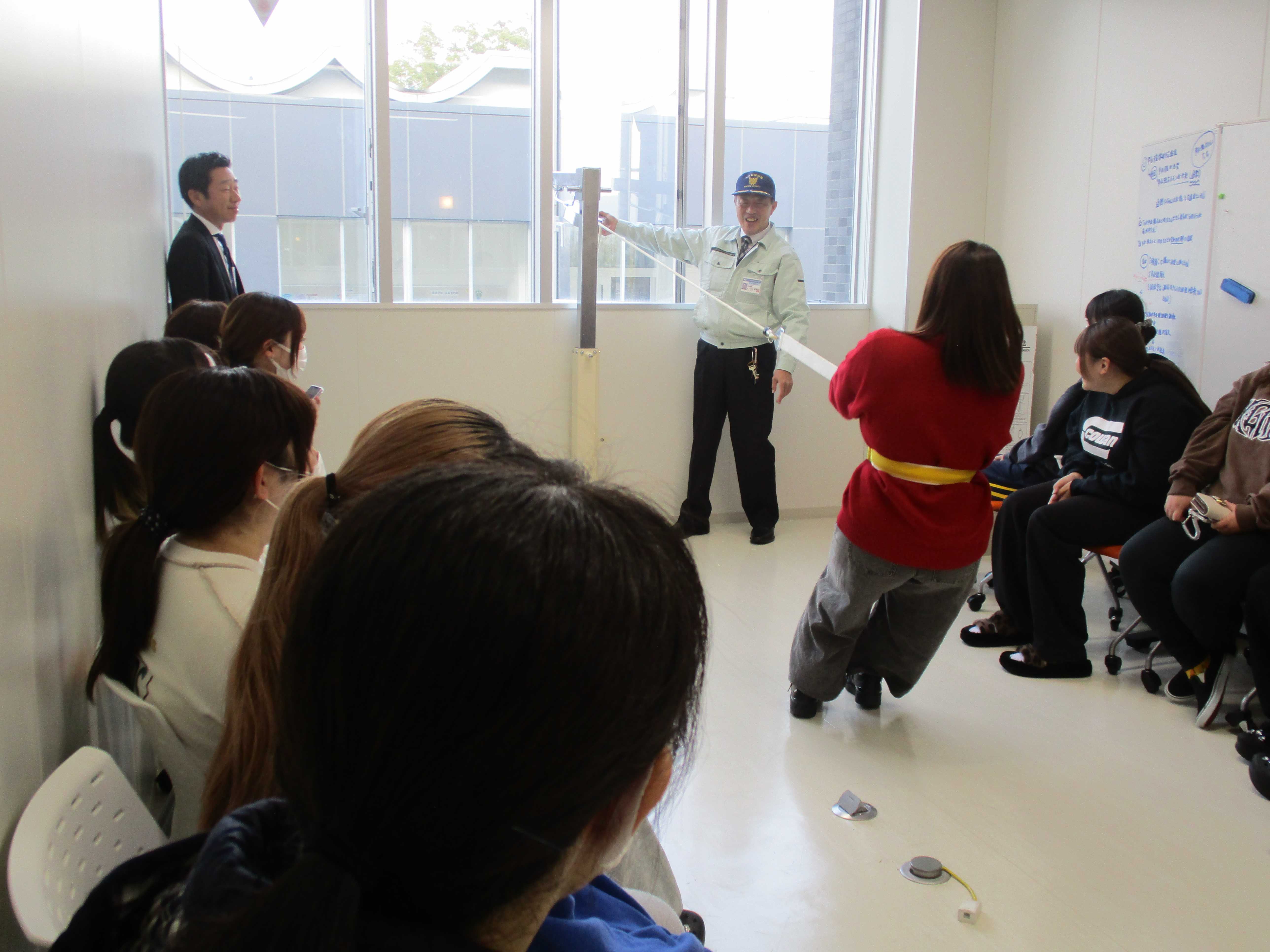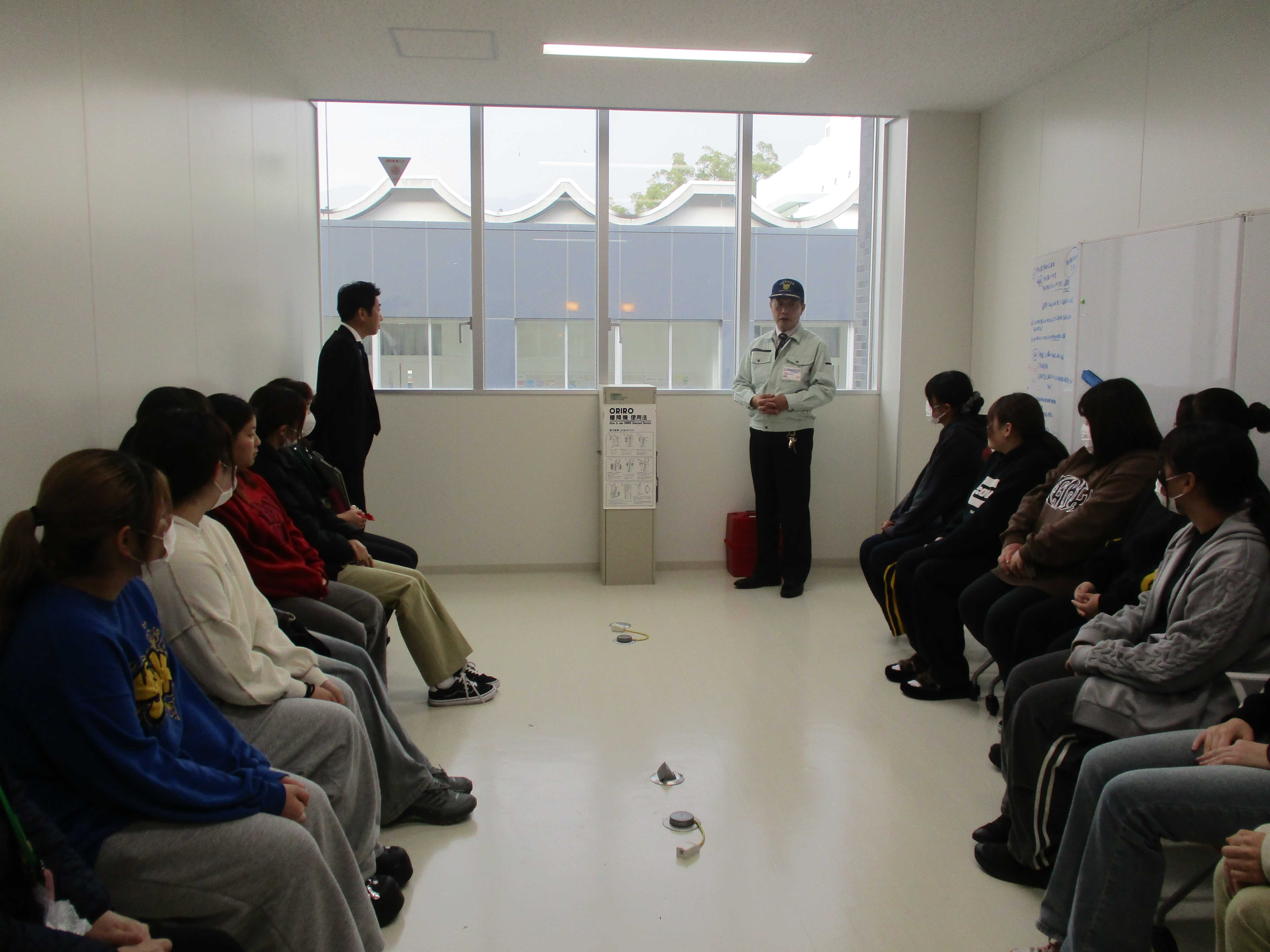 また、講評後には2号館の避難器具(ORIRO)についての説明も行われ、