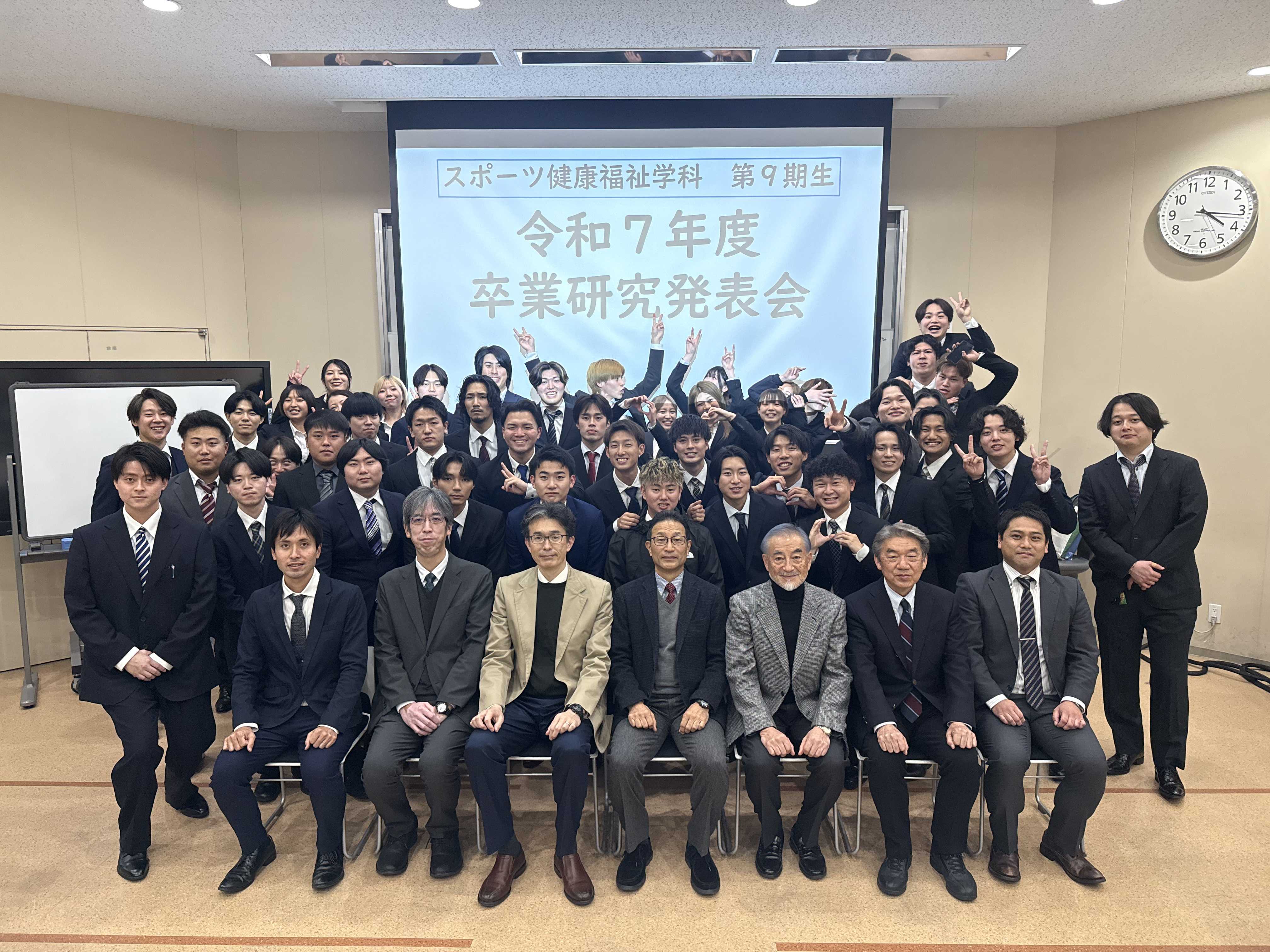 12月24日(水)の午後、神埼キャンパスで「令和7年度卒業研究発表会」を開催しました🏫 スポーツ健康福祉学科9期生44名が緊張した面持ちで発表会に臨みました🎤 同級生に加え後輩の在学生からも活発な質問がなされ、とても有意義な卒論発表会となりました😊 今回の発表会で得た気づきをもとに、来月末の卒業論文完成をめざします💪