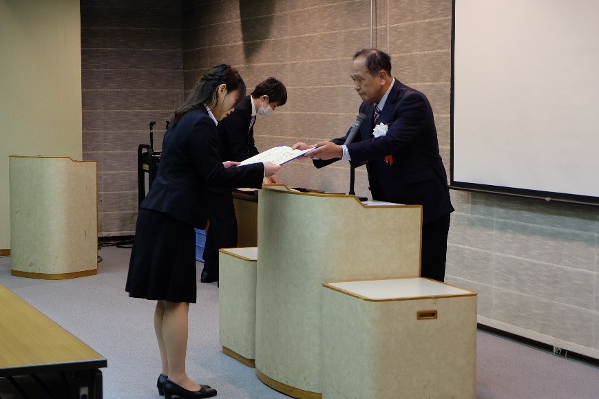 今年度4期8年で研究科長を終了する宮原が挨拶(自身の東北大学大学院時代の話で源義経終焉の地は、奥州平泉でした)したあと、修了生一人一人に修了証書を手渡しました。