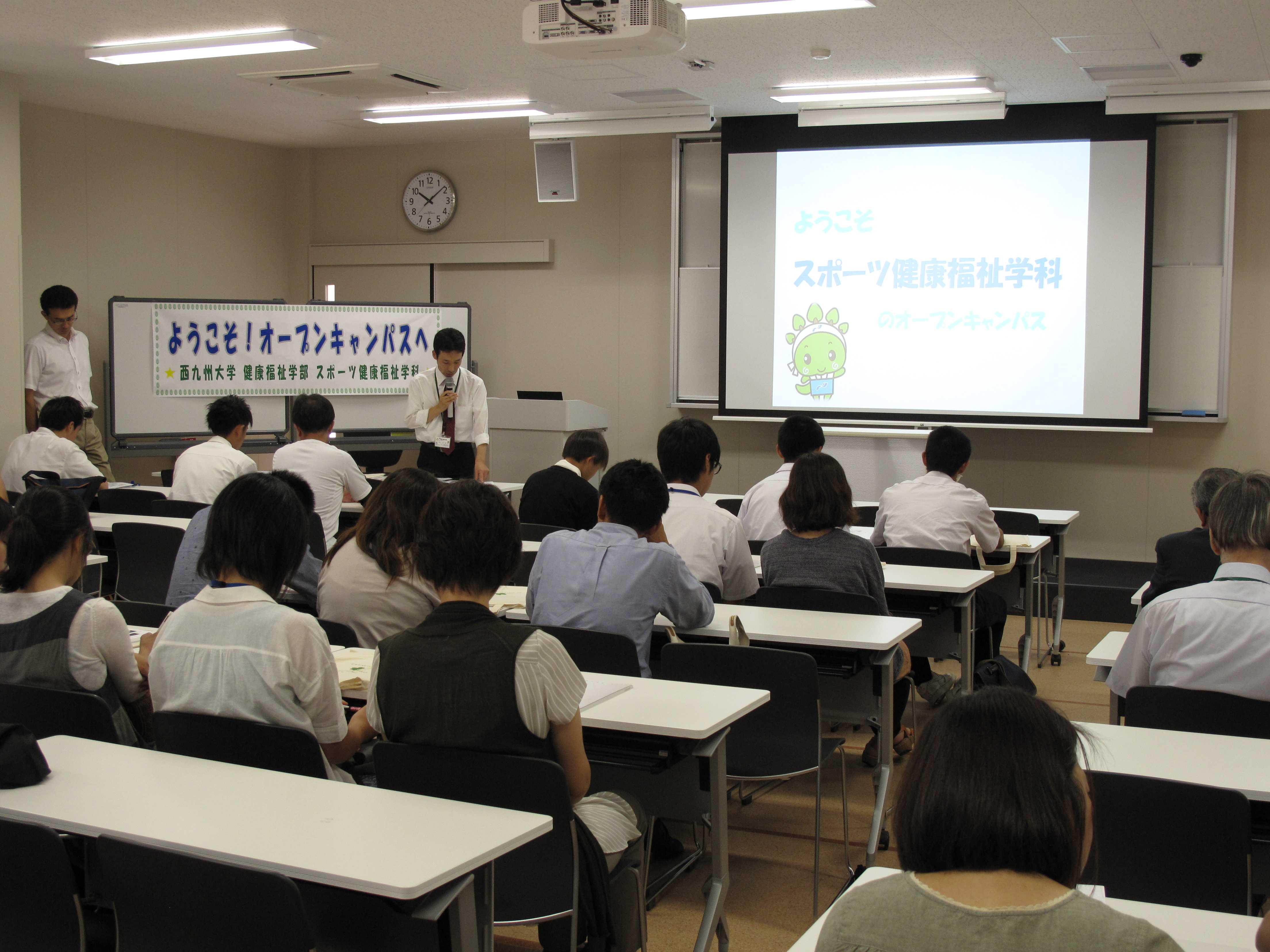 第1回目のオープンキャンパスが開催されました。本学科の教員紹介から始まり学科説明を行い卒業生、在学生(本学卒、現本学大学院生)による説明や体験談などを話していただきました。その後は高校生が本学科教授の管原先生による「スポーツ活動中の熱中症発生と予防」の体験講義を実施しました。昼食は学生食堂にて高校生、保護者、在学生、教職員でカレーライスを食べ楽しいひと時を過ごせたのではないかと思います。午後からはフリートークや本学のサークル見学などを行い「西九州大学」をより深く知っていただけたのではないかと思います。