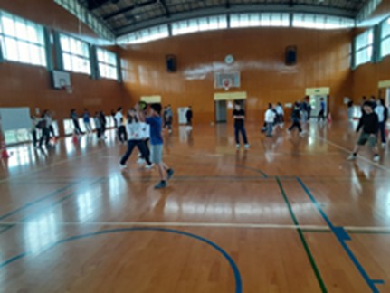 体育館でレクレーション(ドッジビー:フリスビーのドッジボール版)をしました。