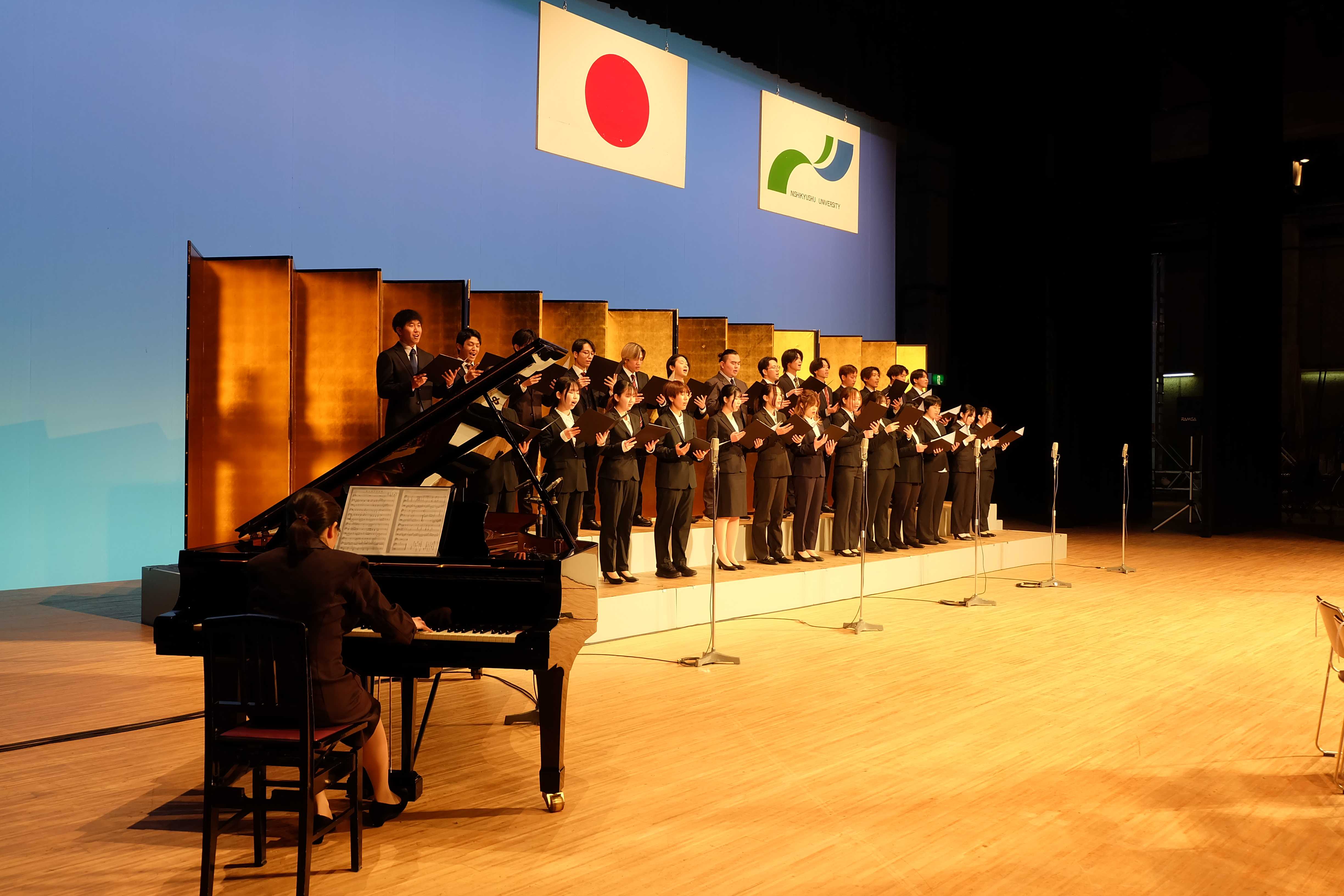 <校歌斉唱>在学生による合唱隊が参加しました。